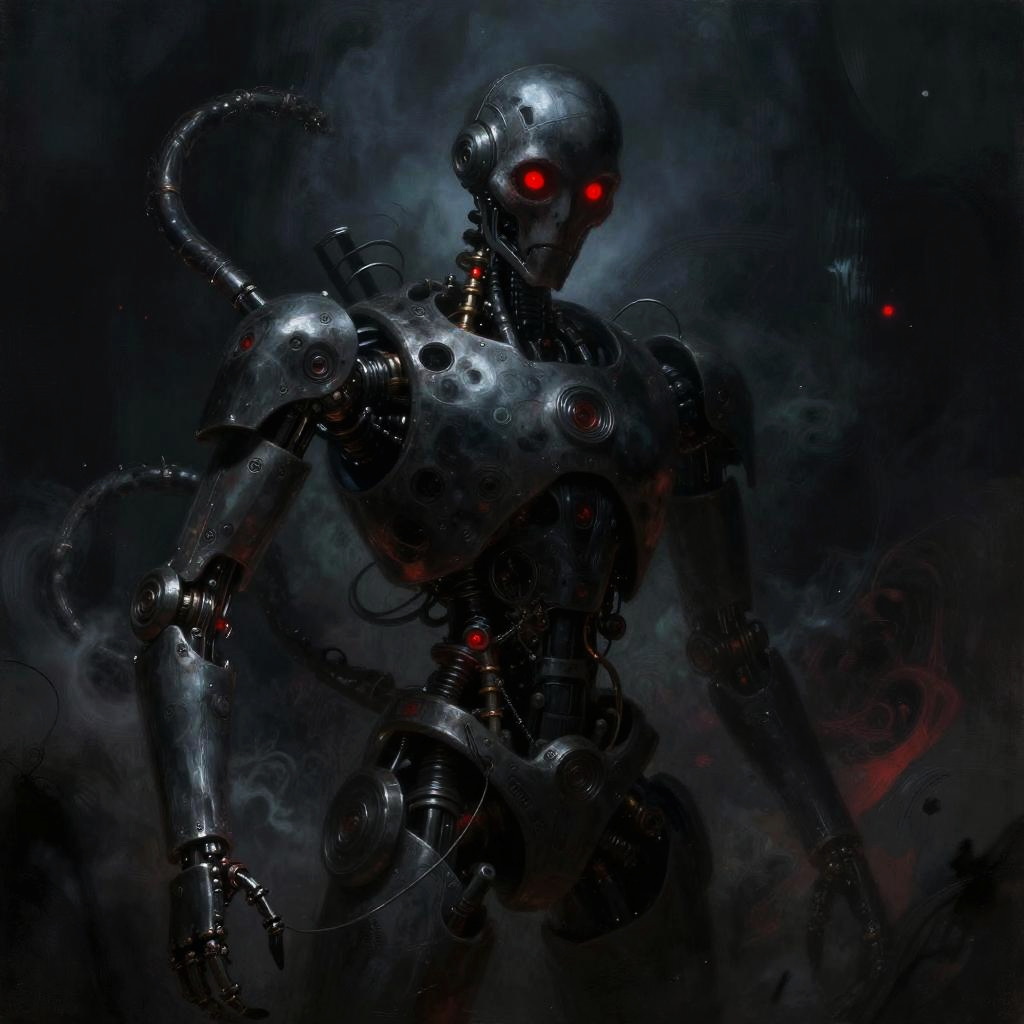 Dark art AI concept showcasing a biomechanical creature emerging from shadows, its body constructed from rusted metal and pulsating dark energy, glowing symbols etched into its frame, set against a bleak industrial wasteland with a dim red horizon, exuding an unsettling futuristic horror vibe.