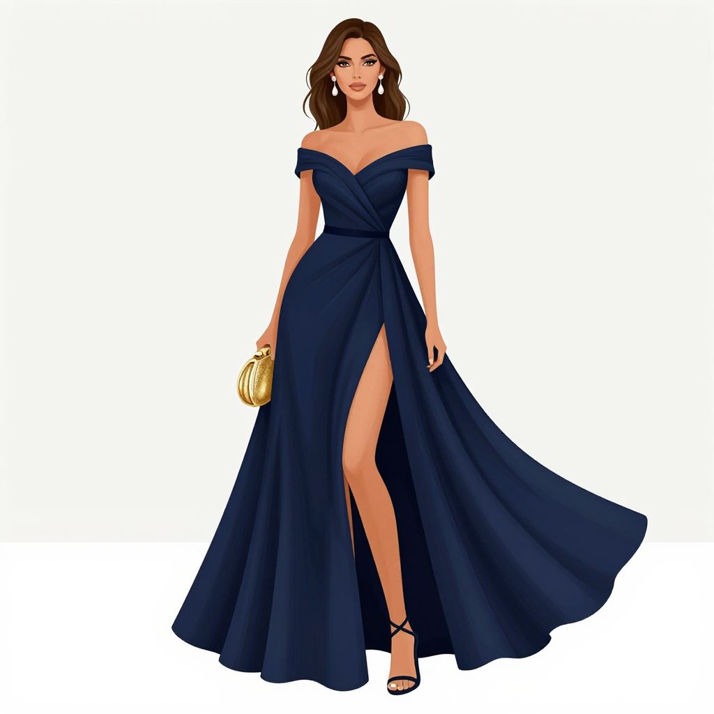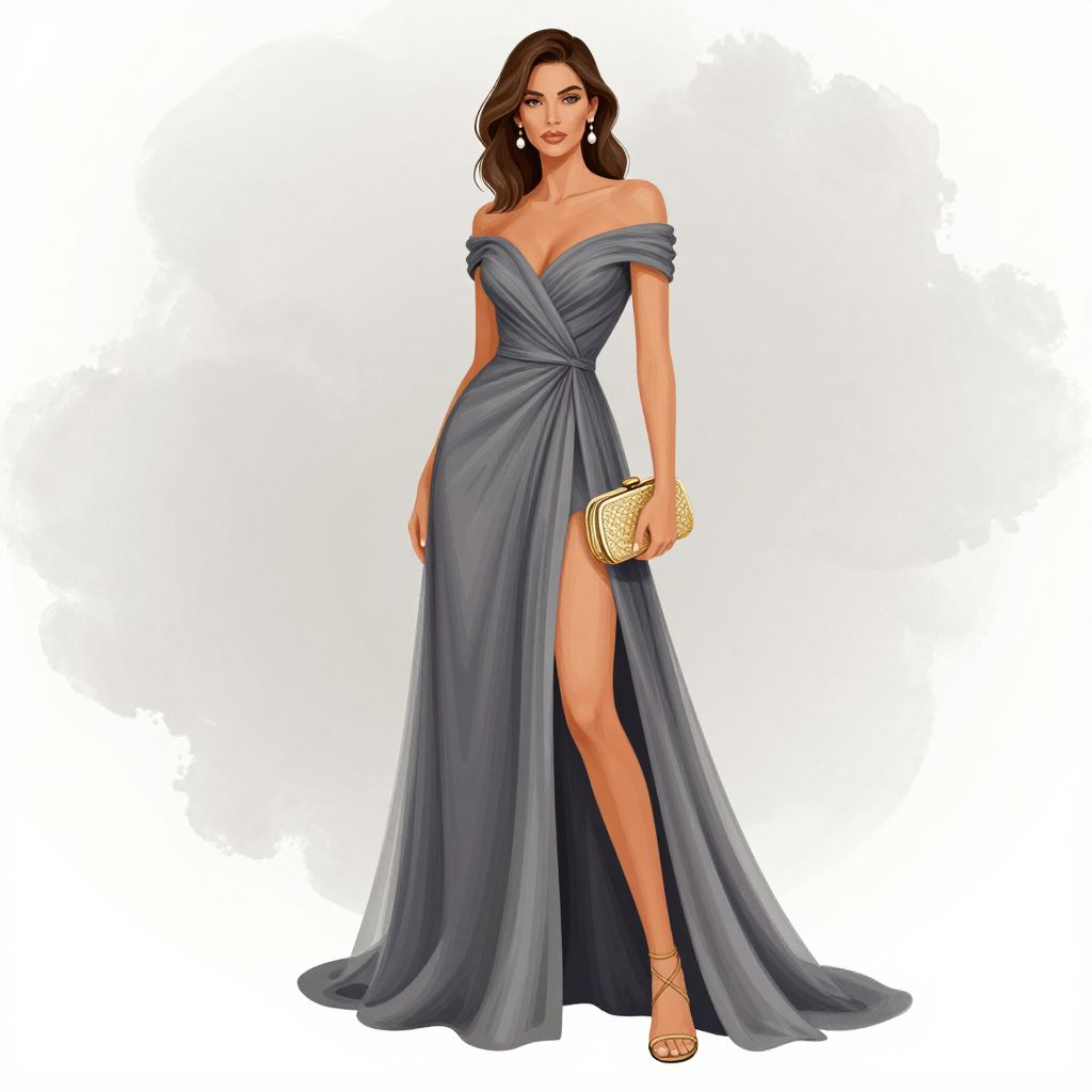 Elegant fashion illustration showcases a woman in a flowing off-the-shoulder gown with a high slit, accessorized with a gold clutch, pearl earrings, and strappy sandals, set against a minimalist background.