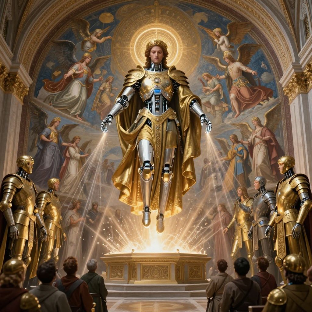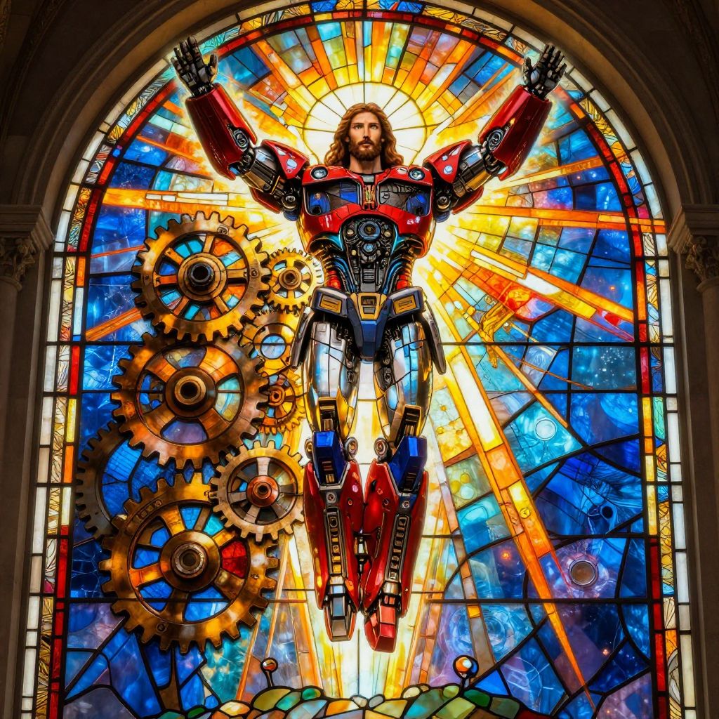 Jesus Christ Transformer ascending with radiant light and gears, combining spirituality and technology, vibrant stained glass effect with modern sci-fi twist, highly detailed and surreal