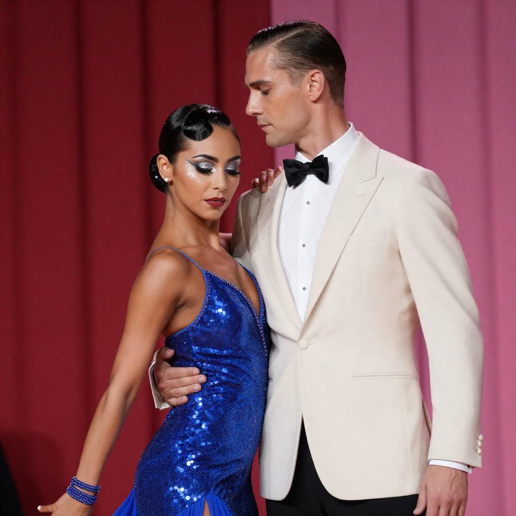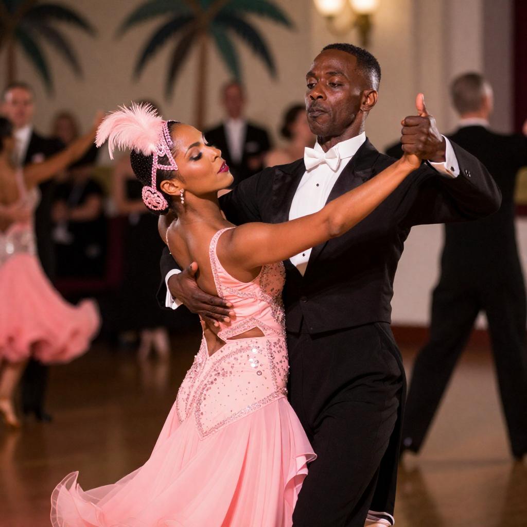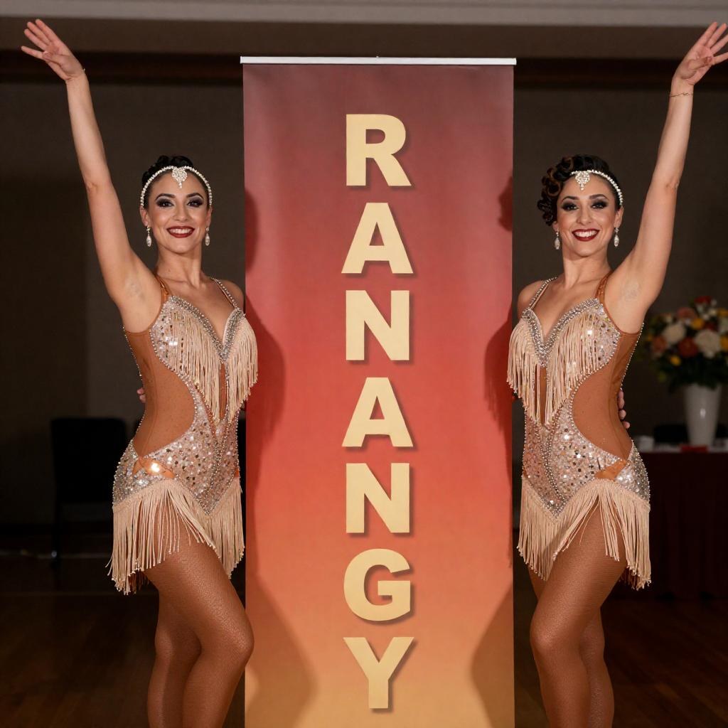 Photograph of two female dancers in sequined, fringed dresses. They stand on either side of a tall, red and gold poster. Both women have short, curly hair, beaded headpieces, and smile brightly. One dancer raises her right arm, the other her left. Background is dimly lit with a hint of floral arrangement on the right.