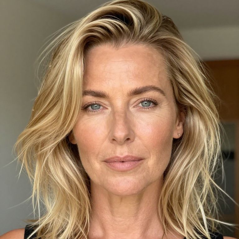 How will I look with blonde hair, hyper-realistic style portrait of a mid-aged individual with sun-kissed blonde hair, soft highlights, slightly tousled hair, warm glow on skin, relaxed expression, subtle depth of field, natural setting