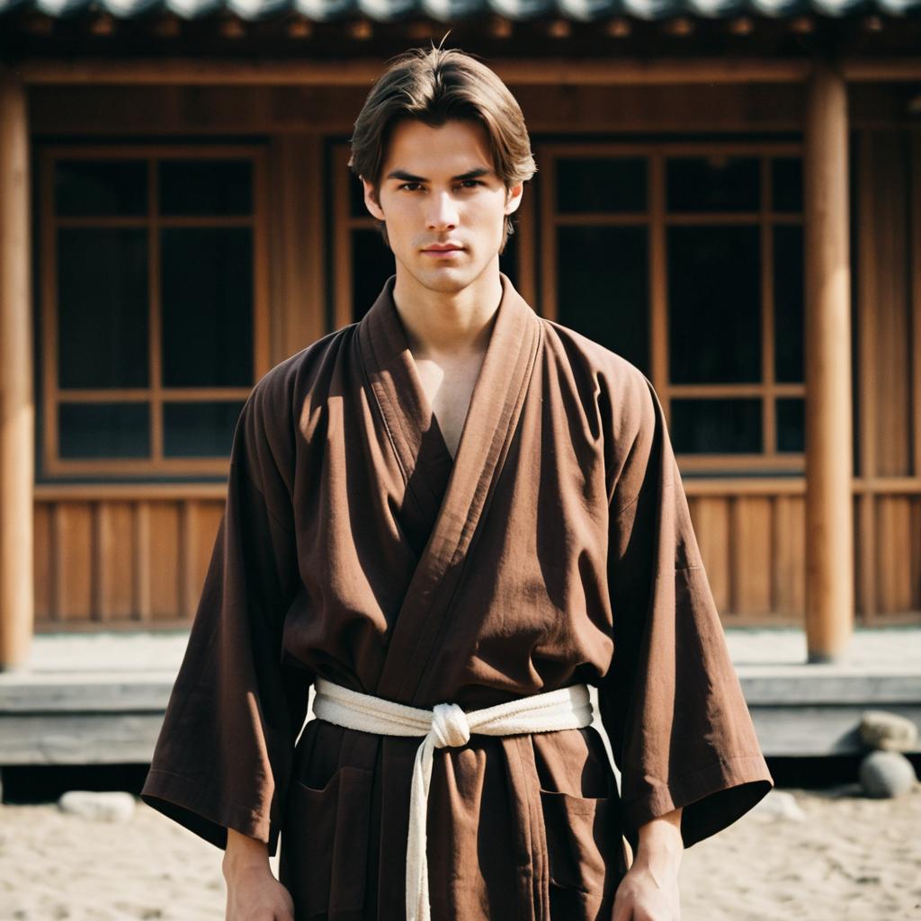 Photograph of a young man with brown hair and a serious expression wearing a brown kimono-style robe tied with a white belt. He is standing in front of a traditional wooden building during daytime with natural light, featuring a slightly out of focus background that gives a realistic and vintage 90s film style appearance.
