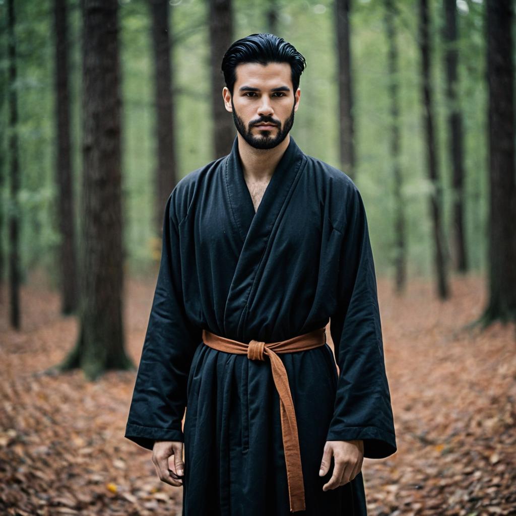 Young Man in Brown Kimono Robe Outdoors