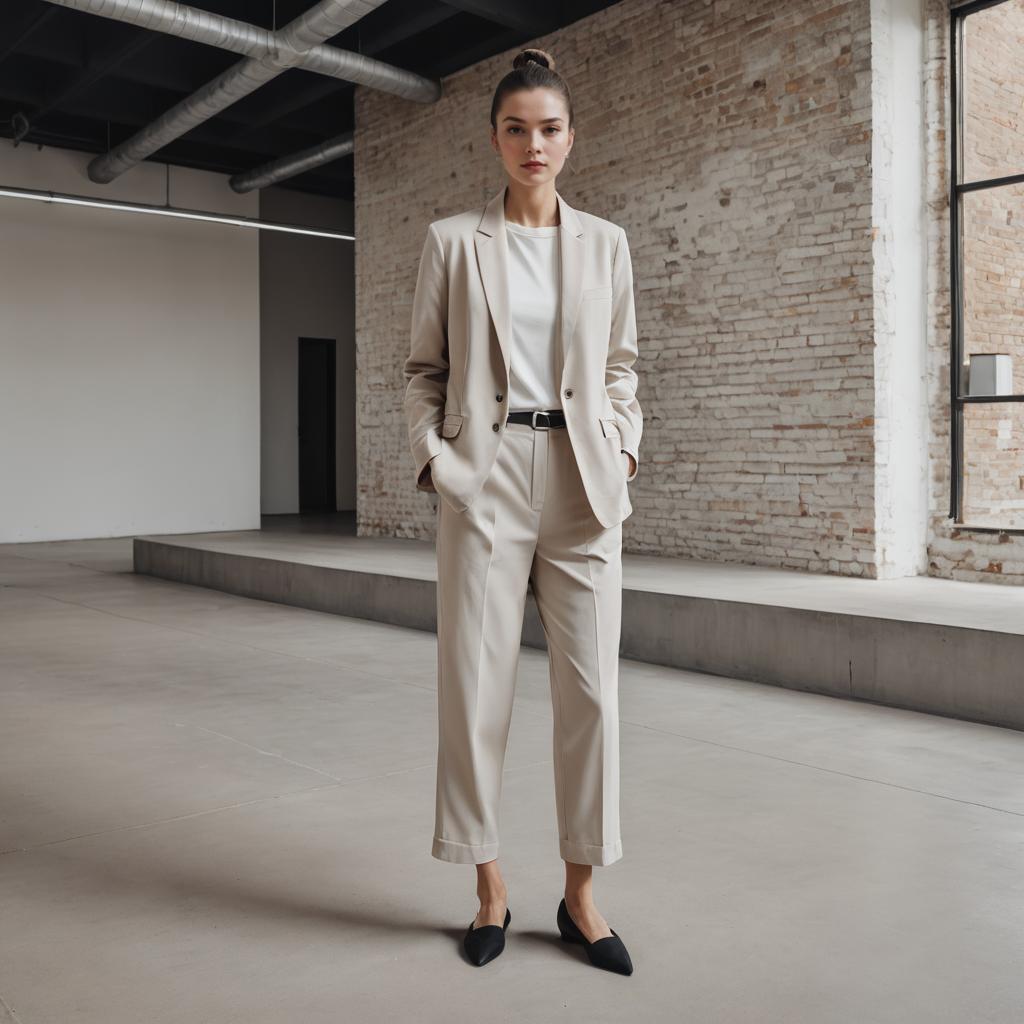 Portrait of a petite woman with sleek high bun hairstyle wearing a minimalist outfit consisting of a tailored desert beige blazer, white cotton t-shirt, beige tailored trousers with a black belt, and black leather espadrille flats. She stands confidently in an industrial loft area with a contemporary architectural backdrop featuring neutral-toned brick and large windows. The look embodies understated elegance and modern style.