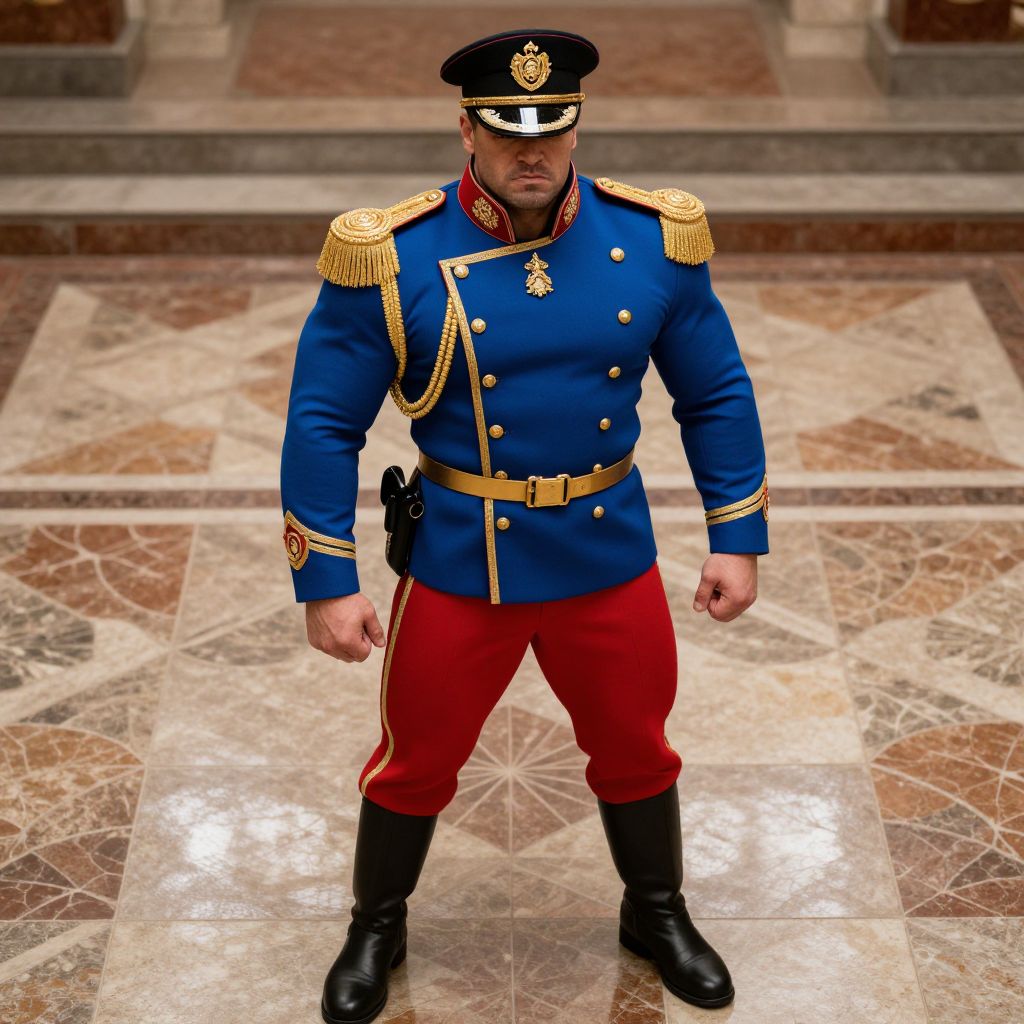 A muscular, stern-looking man in a detailed military uniform, featuring a vibrant blue color with intricate gold accents and a contrasting red skirt. He stands confidently on a glossy, patterned tiled floor. He is wearing a sharp black hat adorned with a distinguished gold emblem.