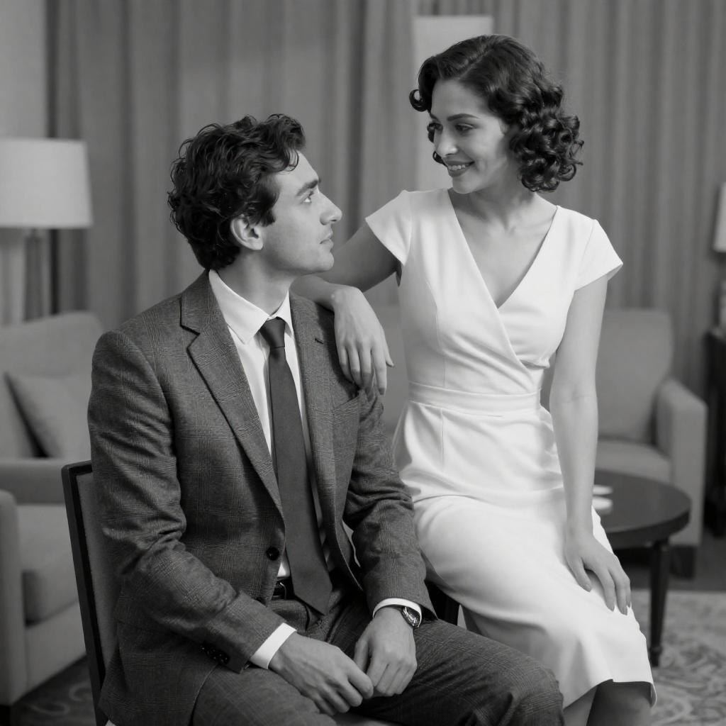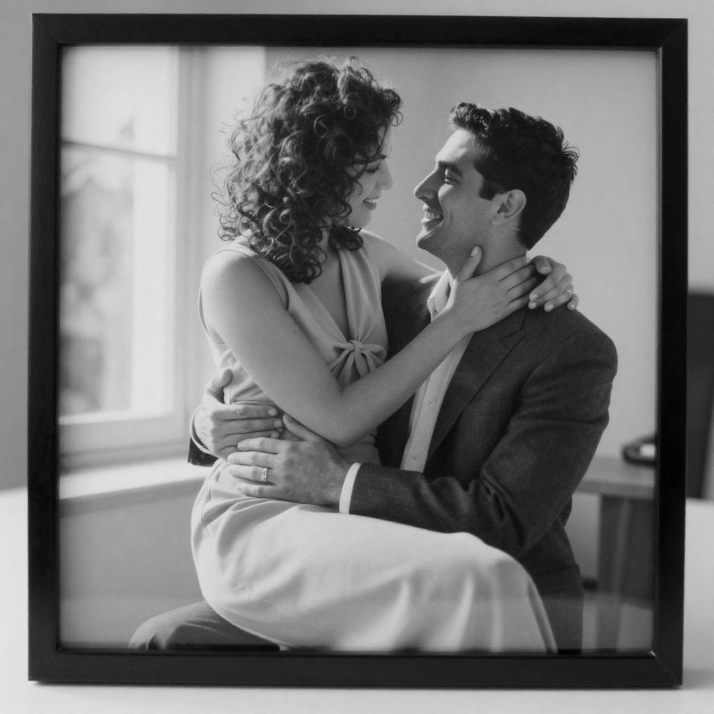 Black-and-white photograph of a man and woman in an intimate pose. Woman with curly hair, wearing a light-colored dress with a bow, sitting on a man's lap. Man in a suit, smiling, holding her waist. Framed photo on table. Sunlight from window. Man's left hand on her chest. Woman's right hand on his neck. Woman's expression focused on man. Man's expression warm and affectionate.