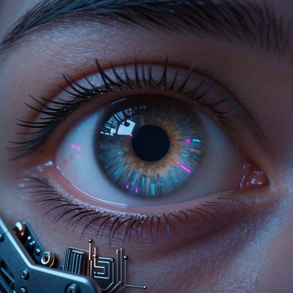 Close-up of a prosthetic eye with vivid iris details, glassy surface reflecting a cyberpunk cityscape, neon colors, detailed circuitry embedded around the eye socket, blending human and robotic aesthetics with a dark, moody atmosphere.