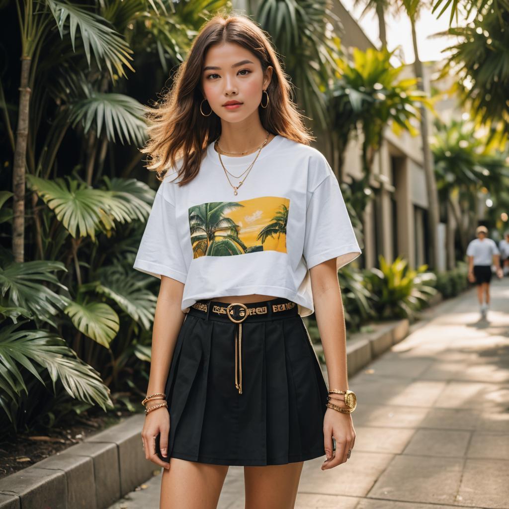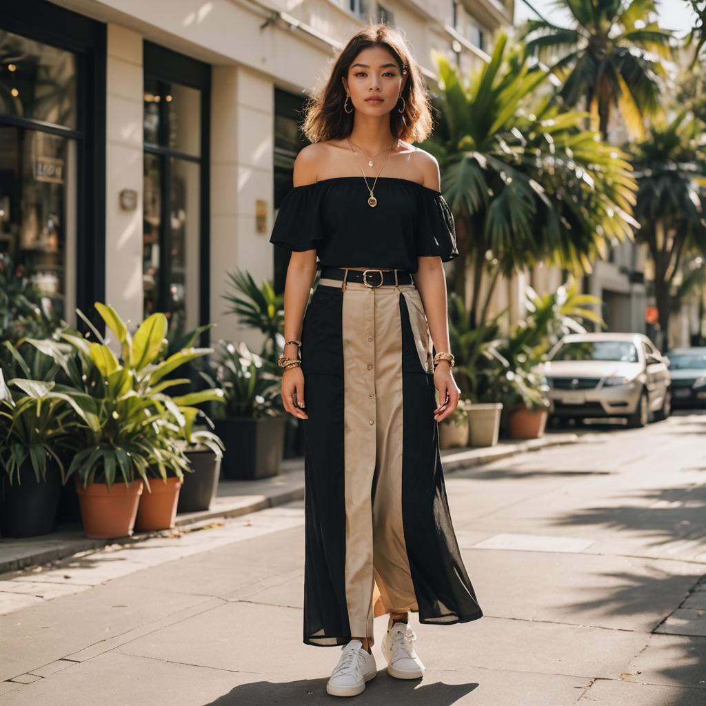 Trendy teenage fashion ideas, full-body, sunlit photograph showcasing a youthful street style ensemble. The subject is wearing a sheer black off-the-shoulder blouse and a low-rise cargo maxi-skirt in beige. Accessories include a simple gold necklace and sleek kitten heels with pointed toes. The scene is a sun-drenched sidewalk with blurred tropical foliage in the background. Y2K fashion, trendy, street photography, realistic, high detail.