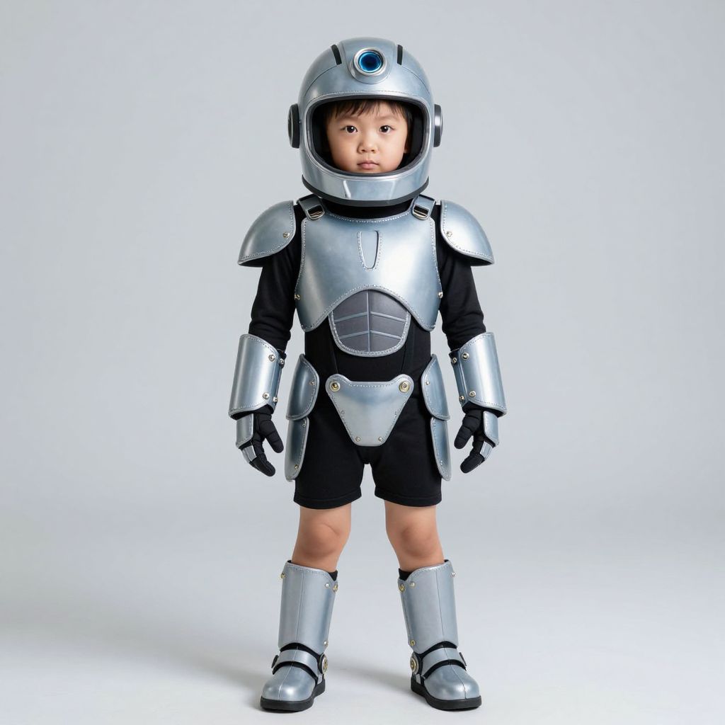 Photograph of a young Asian child in silver astronaut armor with black shorts, helmet, gloves, and boots, standing against a white background.