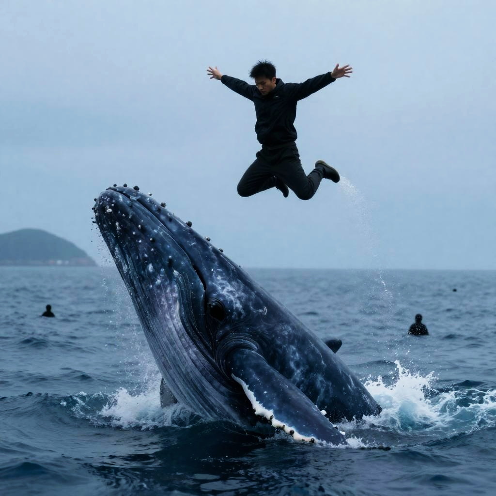 Man mid-air, arms outstretched, wearing dark clothing, above large whale with open mouth, splashing water, blue ocean background, distant island, two dark silhouetted figures in water, dramatic lighting.