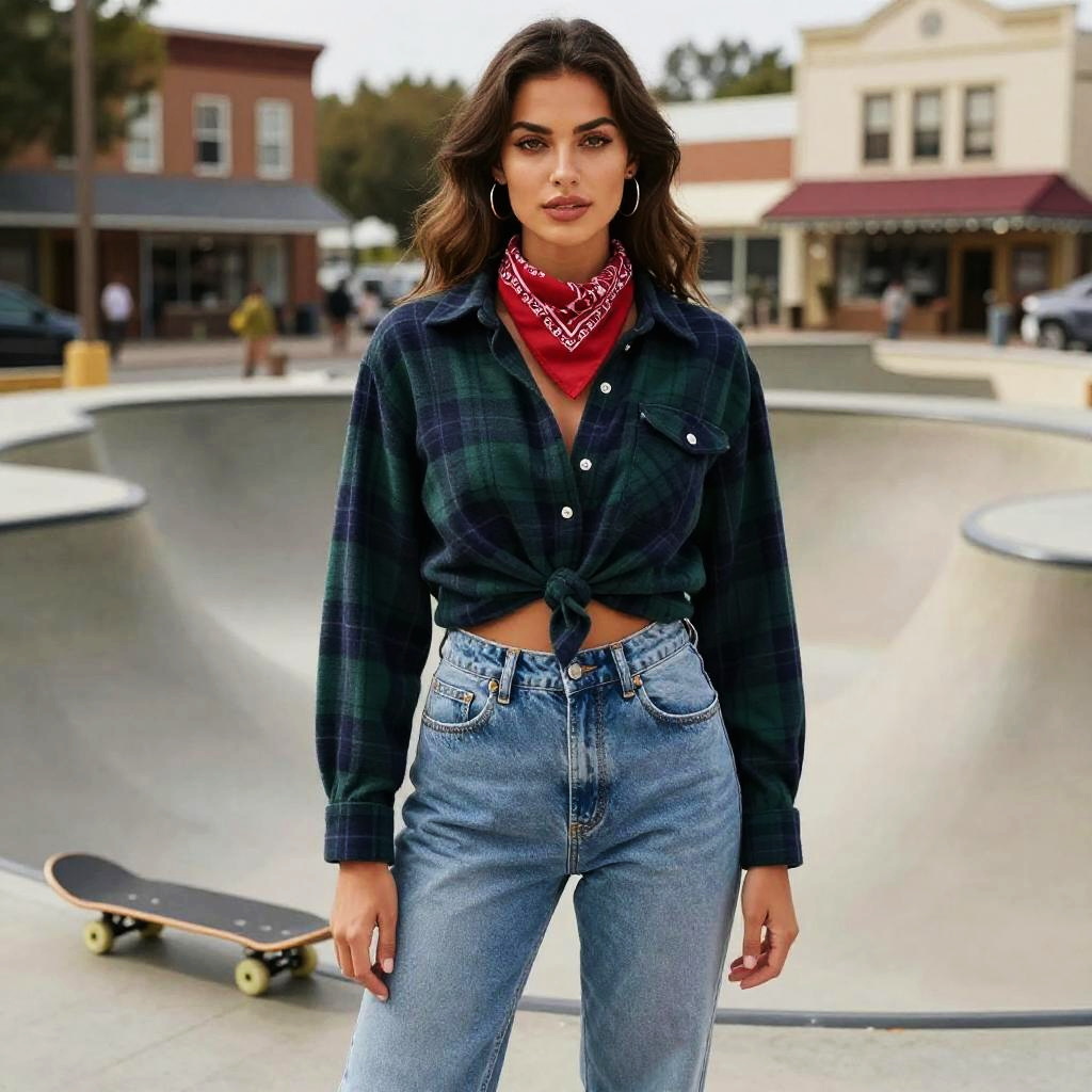 A Slim woman, styled in a dark horse visual aesthetic, wearing a knotted plaid flannel shirt in navy and dark green, paired with high-waisted light wash denim jeans and a red bandana around her neck, standing confidently at a skate park in a small town. Sexy. Pretty face and beutiful eyes