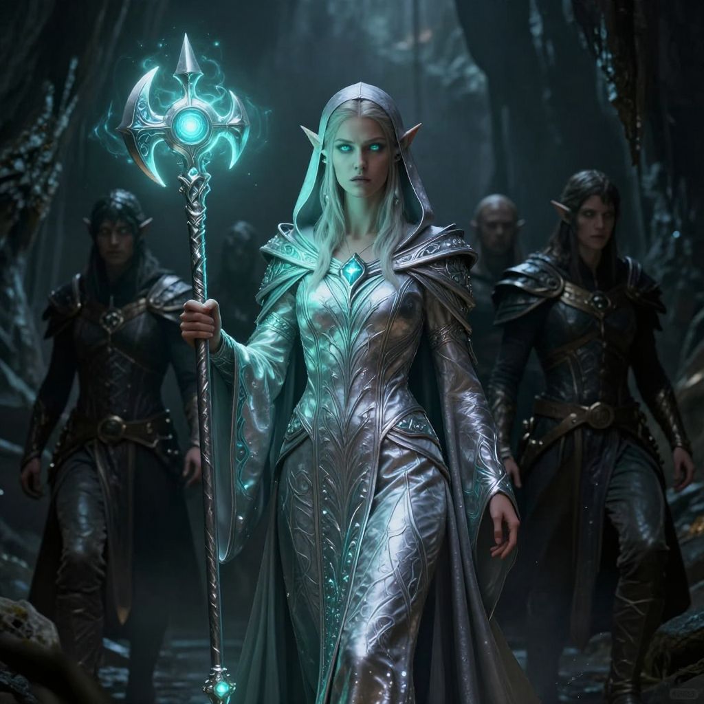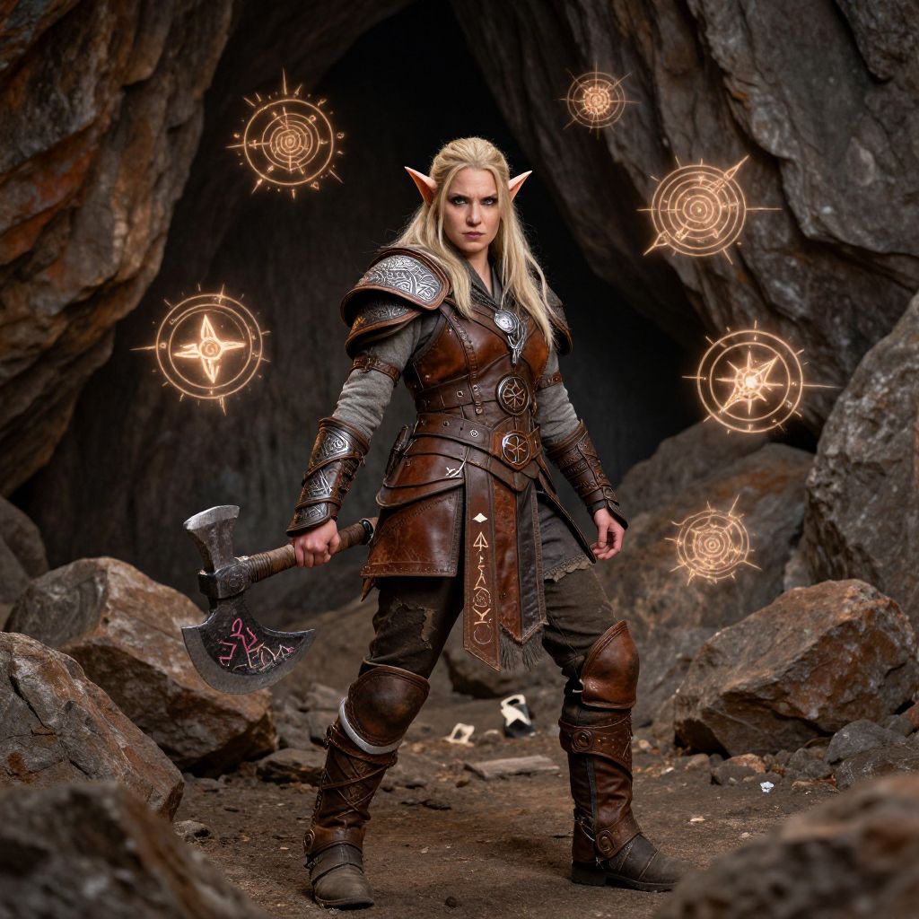 Photograph of a fierce, blonde, elven woman standing in a rocky cave. She has pointed ears, wearing dark brown, medieval-style armor with intricate silver patterns, and dark green pants. She holds a large, double-bladed axe with glowing runes in her right hand. Her expression is determined. Surrounding her are glowing magical symbols, adding a mystical aura. The cave's dark, rocky walls frame her, with jagged rocks scattered on the ground. The lighting highlights her figure and the glowing runes, casting shadows that enhance the dramatic, fantasy setting.