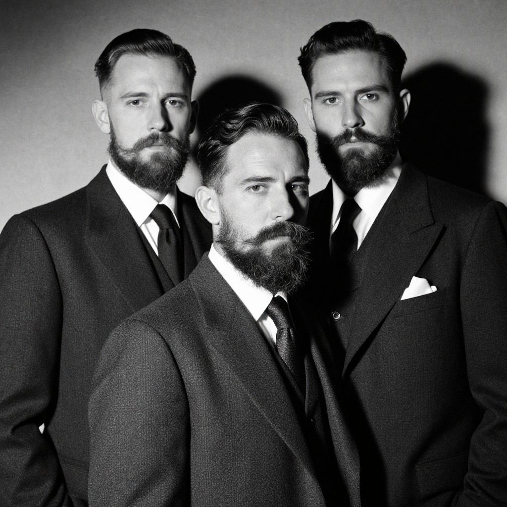 Black and white photograph of models with beards in classic tailored suits, vintage style studio setup with dramatic shadows, strong contrast highlighting the textures of beards and fabrics, timeless sophisticated mood, high resolution monochrome portrait.