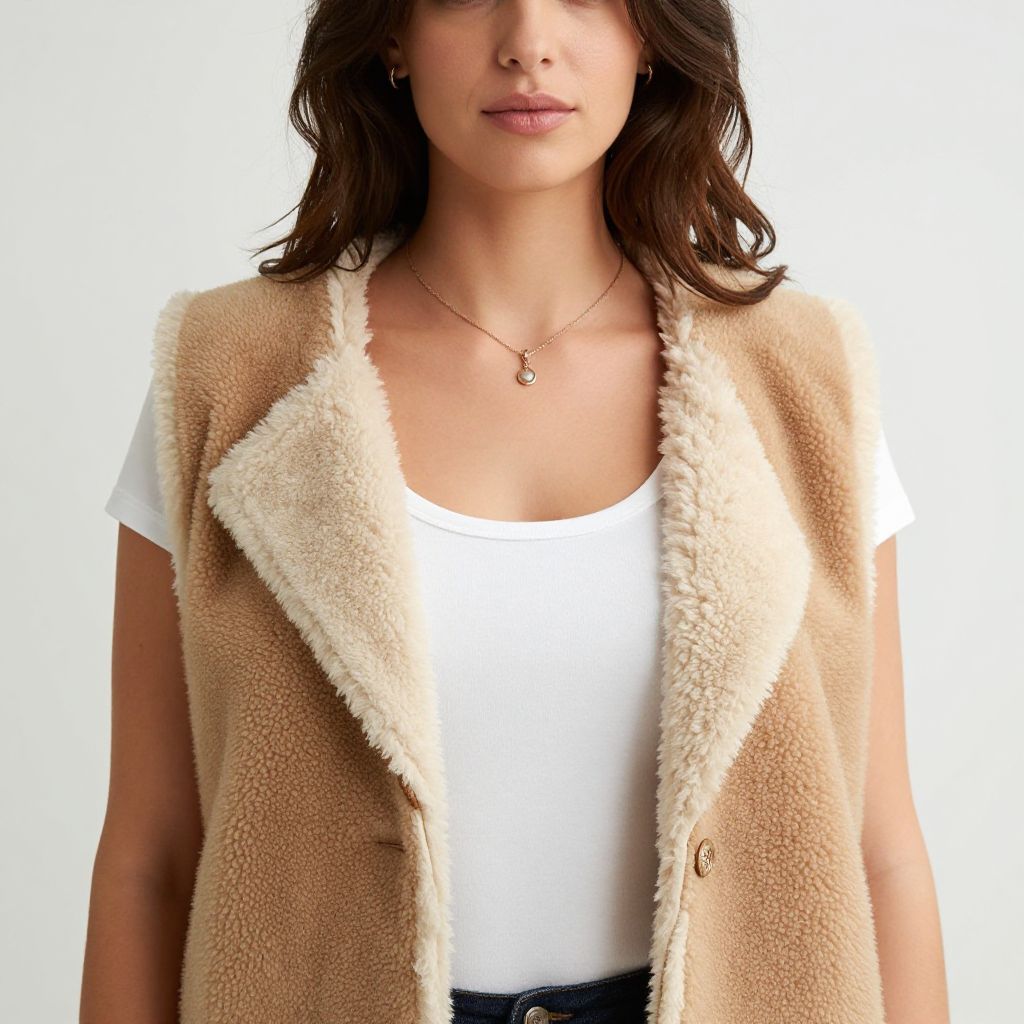 Photograph of a young woman with fair skin and wavy dark brown hair, wearing a white t-shirt and a beige, fuzzy, sleeveless vest with a soft, shearling lining. She has a delicate gold necklace with a small pendant. Her lips are slightly parted, and she is looking slightly to the right. The background is plain white, making her outfit the focal point. The vest has a single button on the left side. The lighting is bright, highlighting the texture of the vest and her smooth skin.