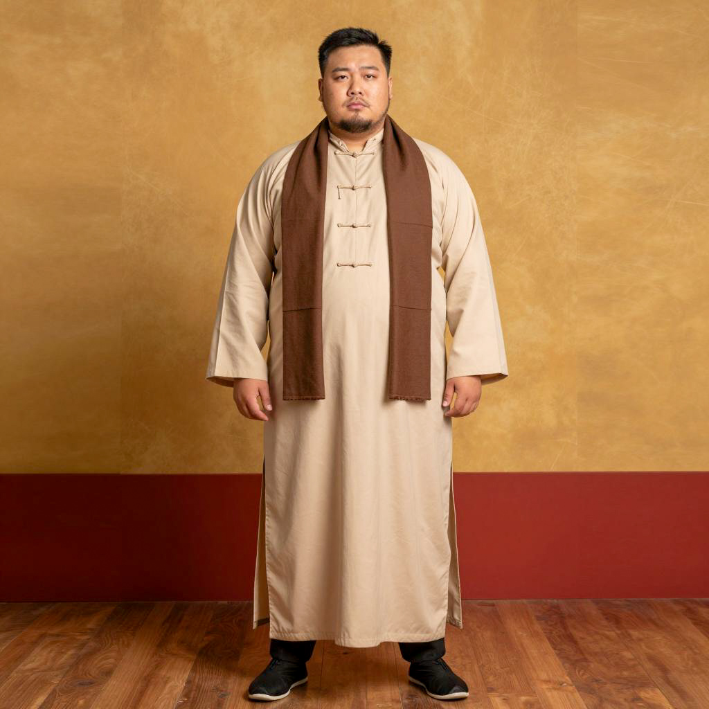 Plus size costume adult plus, photorealistic, full-body, Asian man, short black hair, beard, standing, wearing long beige traditional outfit, brown scarf draped over shoulders, black shoes, serious expression, background: golden fabric, red cloth at bottom, wooden floor, studio lighting, realistic ures, centered, front view