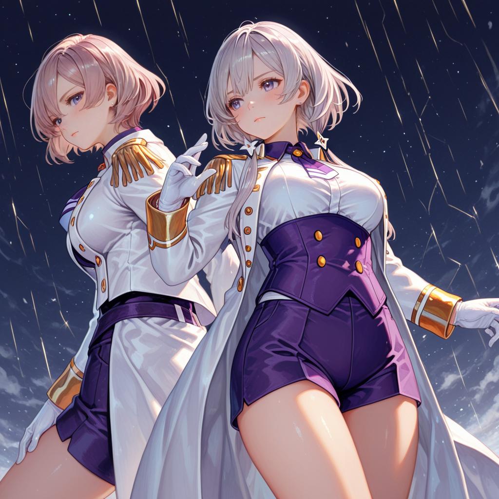 Anime-style illustration of a young woman with short grey hair and blue eyes, wearing a white military jacket with gold epaulets and buttons, white gloves, and purple high-waisted shorts with a corset. She is posed against a bright, softly lit background with large arched windows, highlighting her confident and composed expression.