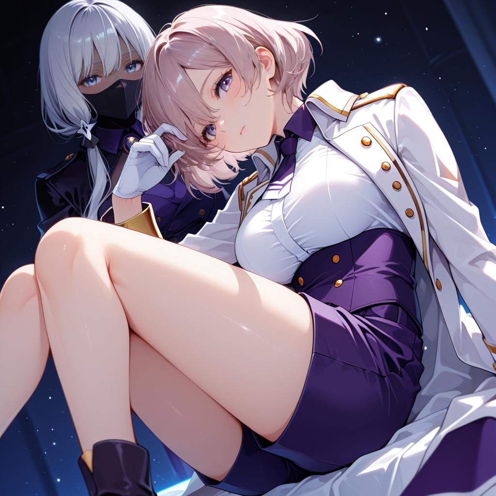 Mujina, gridman universe, 1girl, blue eyes, hair between eyes, short hair, brown hair, grey hair, large breasts, thighs, white gloves, white jacket, military jacket, purple shorts, corset, by artist toutenkou, dark_illustrious