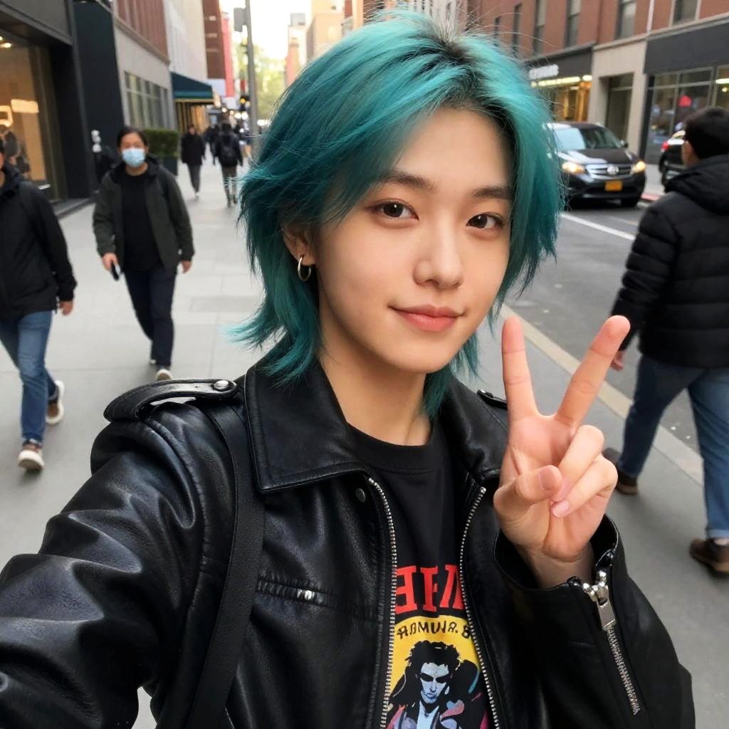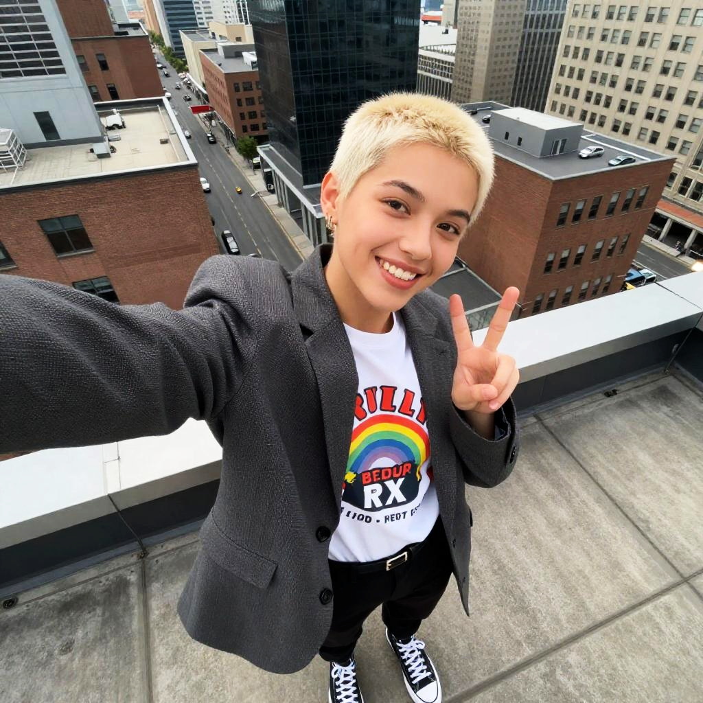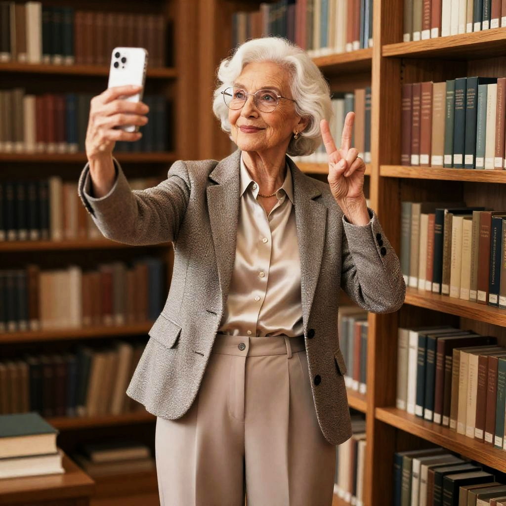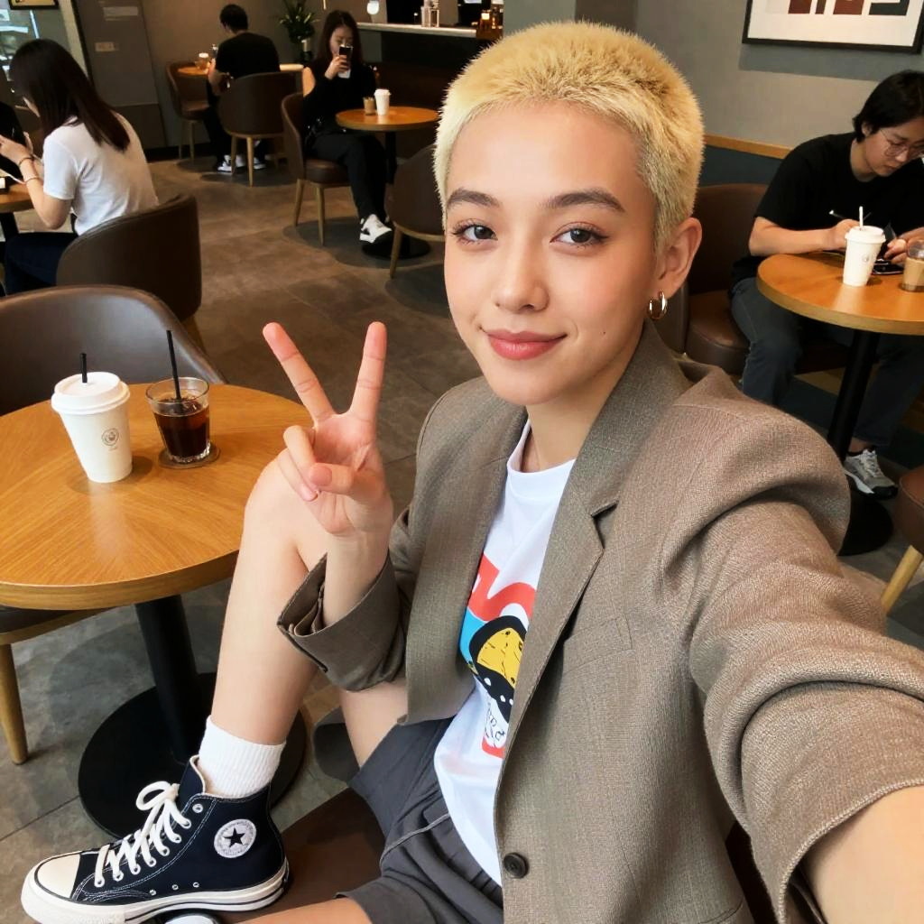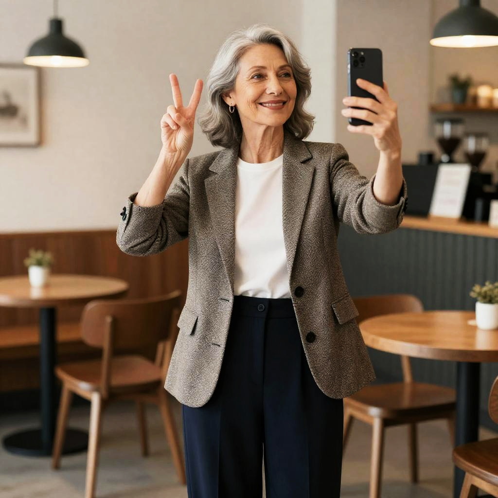 A middle-aged woman with red hair is taking a selfie in a cozy coffee shop, wearing a stylish leather jacket and a floral dress. She poses with a cheerful peace sign, captured in a semi-realistic style.