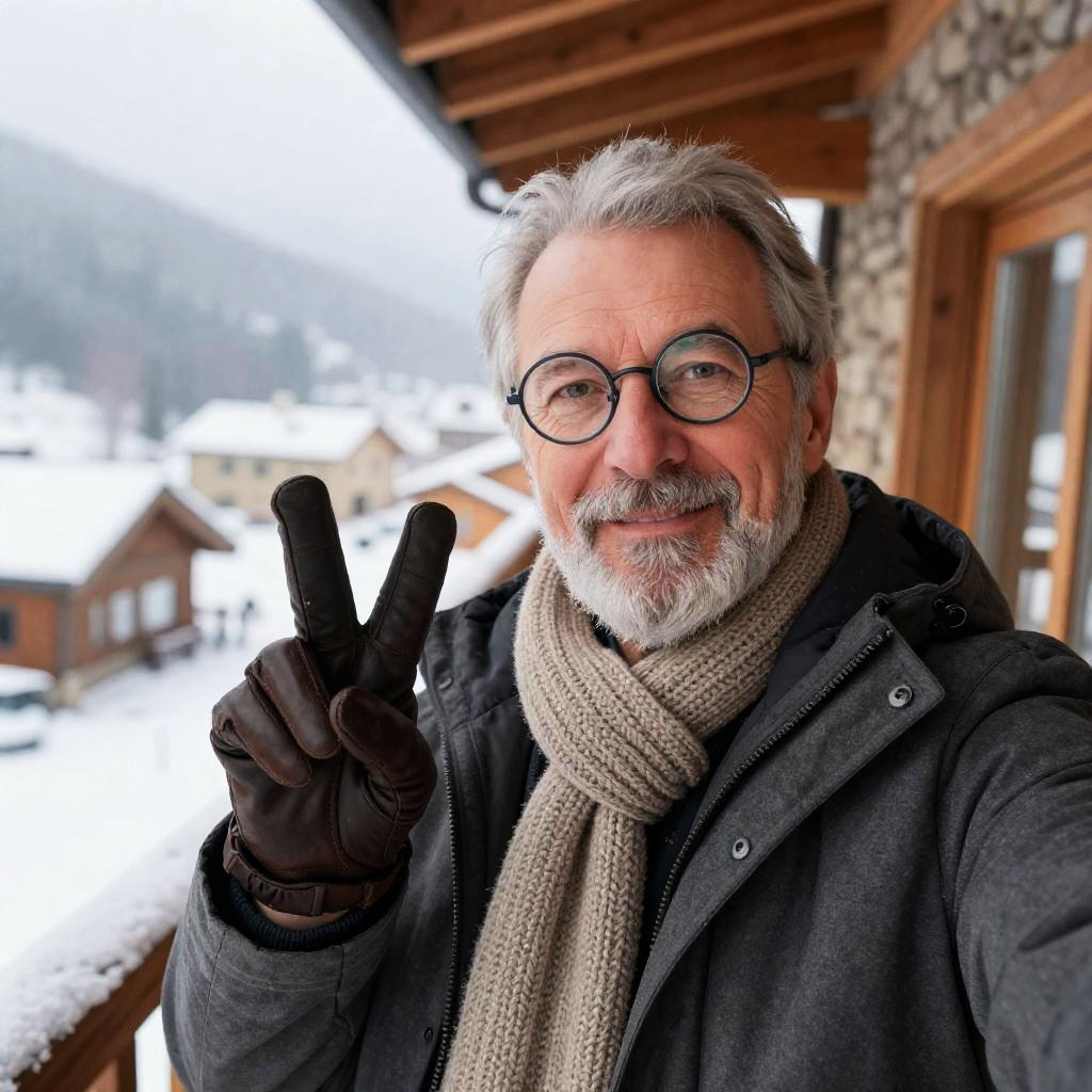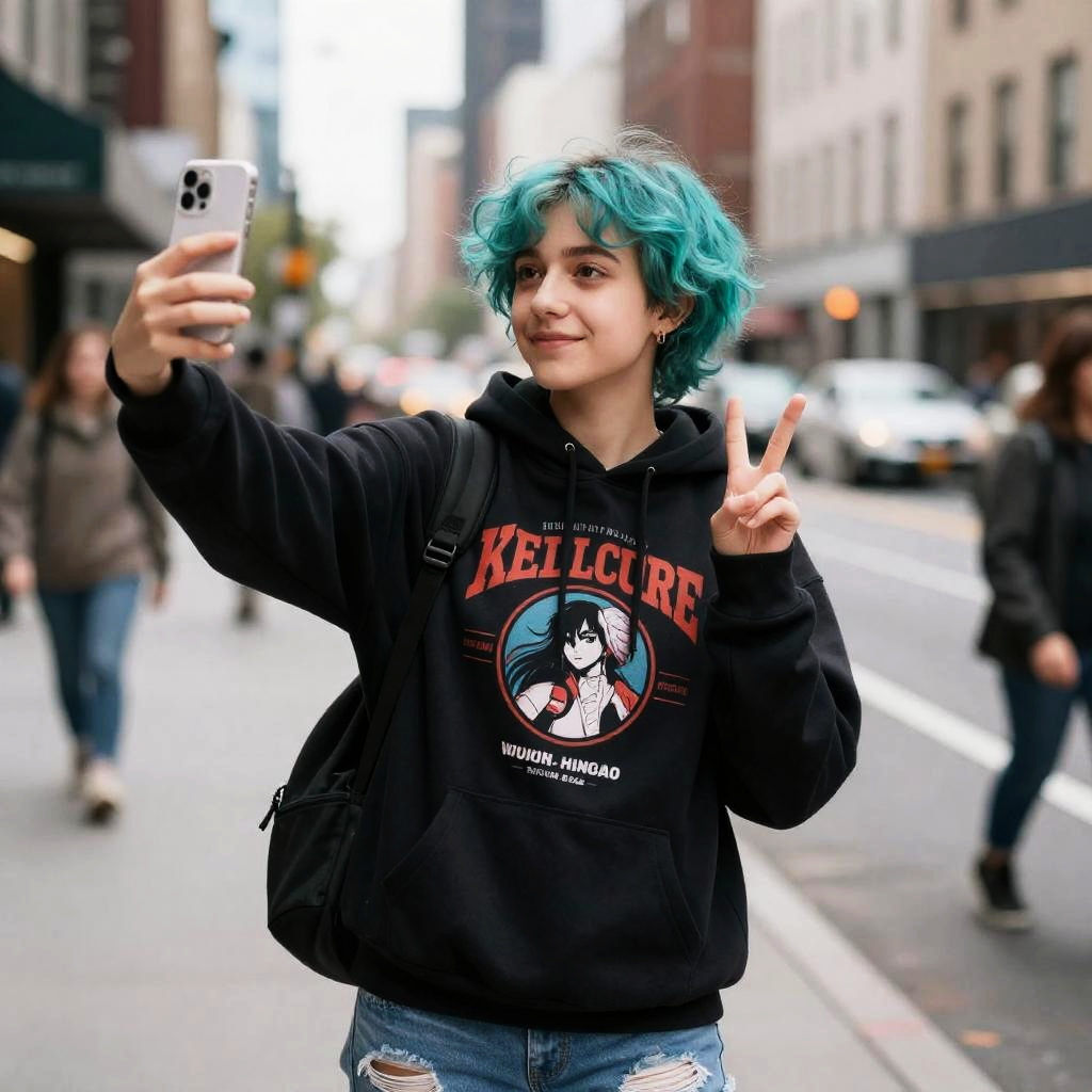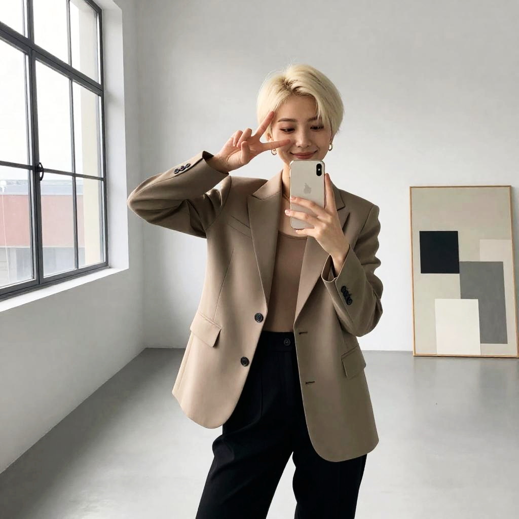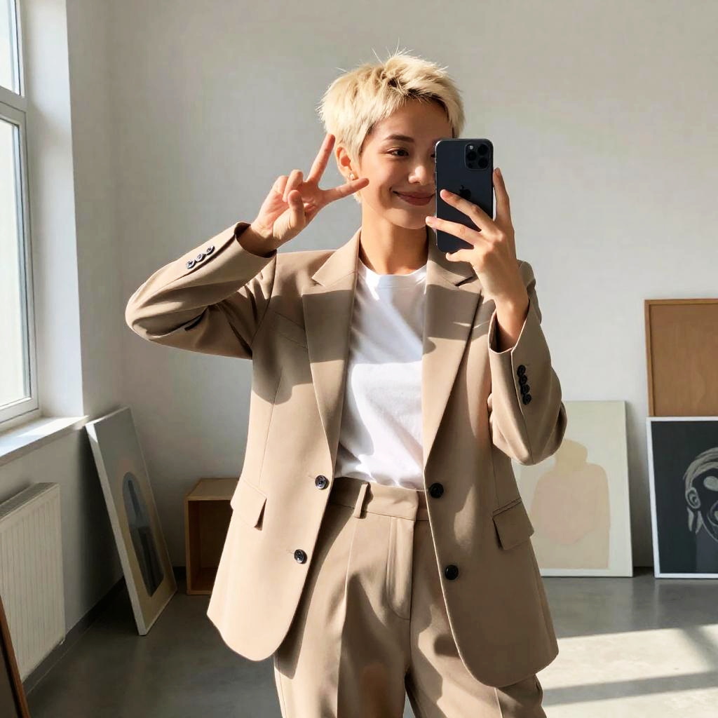 A middle-aged woman with red hair is taking a selfie in a cozy coffee shop, wearing a stylish leather jacket and a floral dress. She poses with a cheerful peace sign, captured in a semi-realistic style.