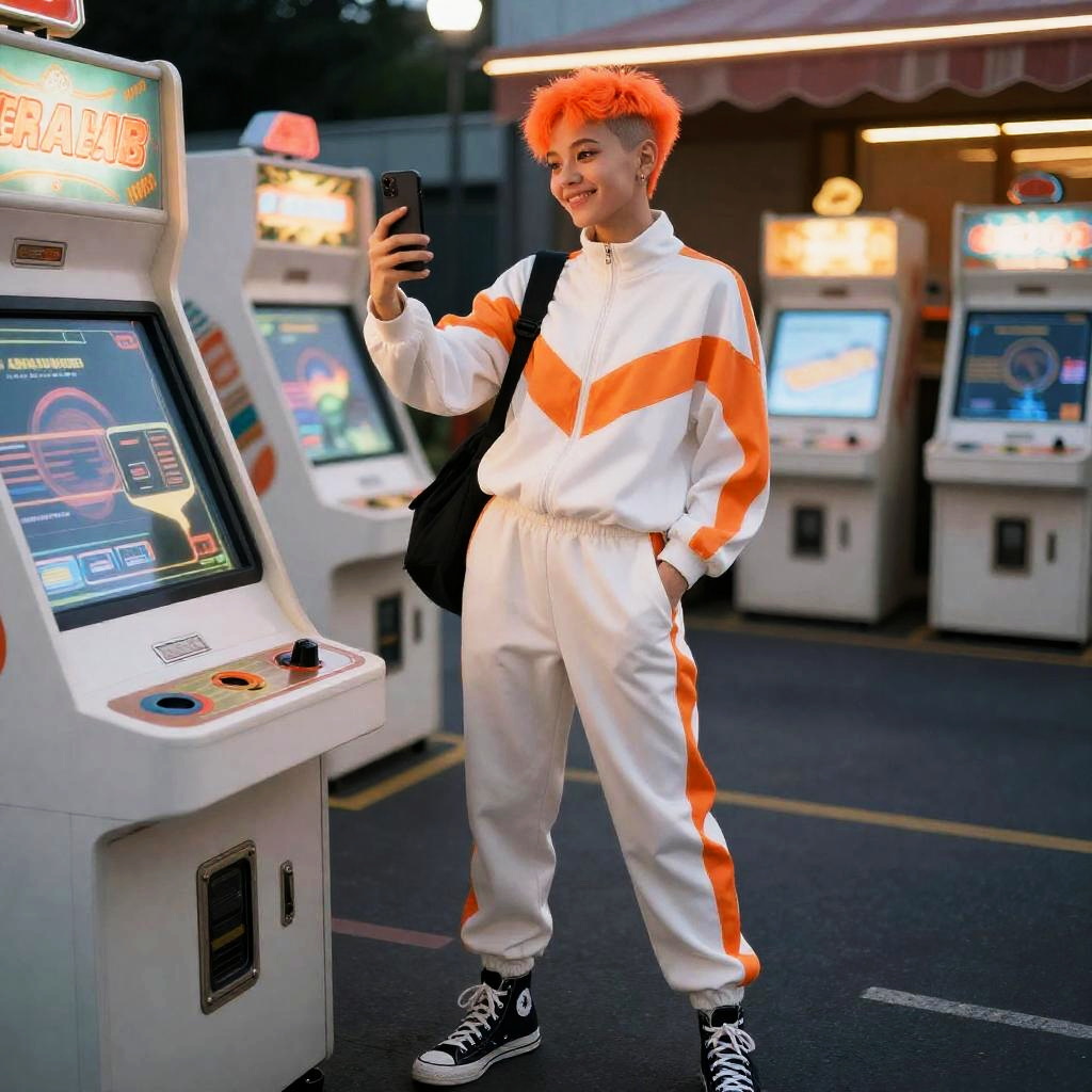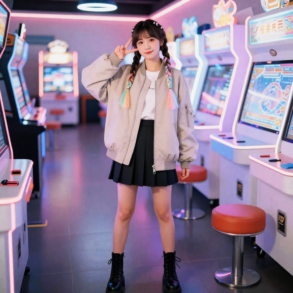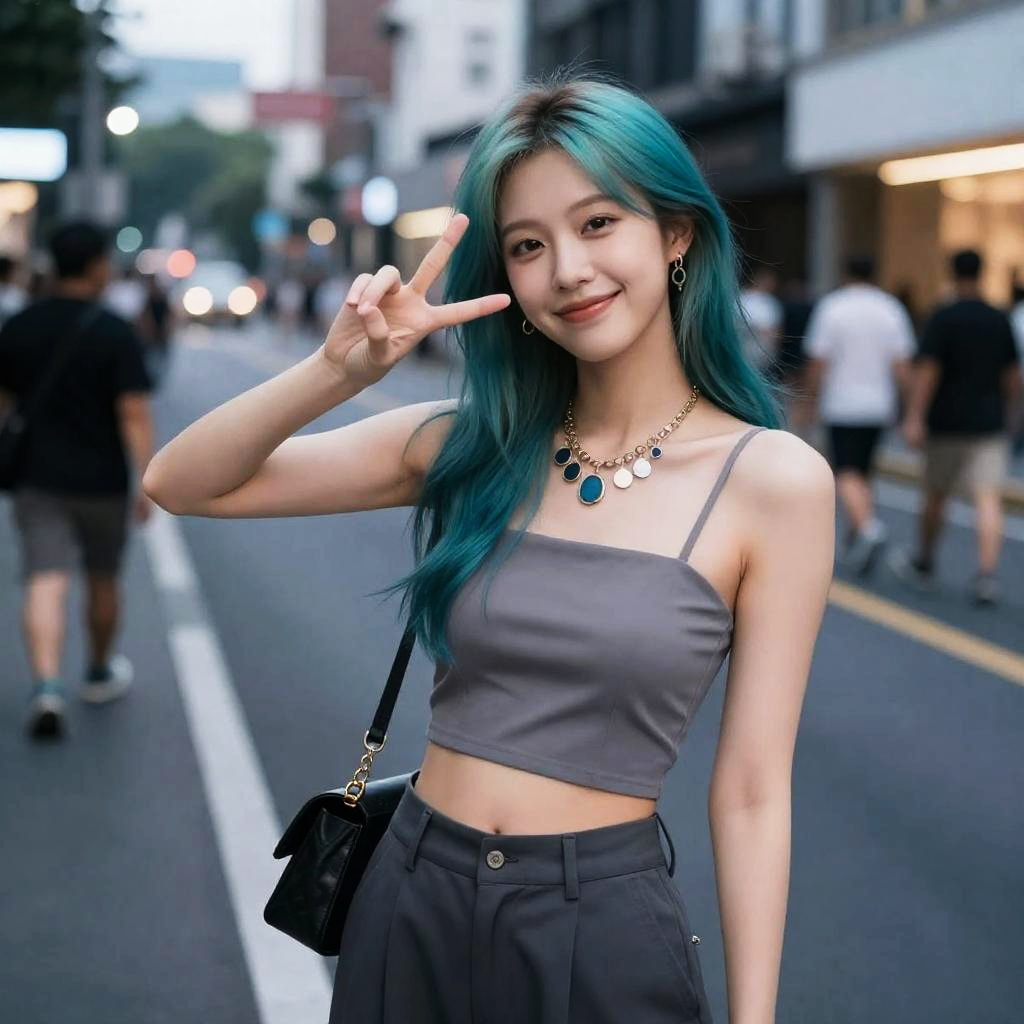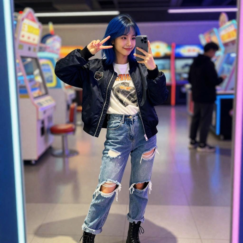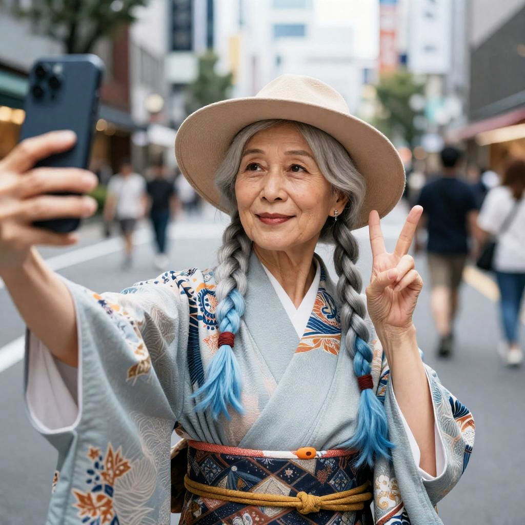 A middle-aged woman with red hair is taking a selfie in a cozy coffee shop, wearing a stylish leather jacket and a floral dress. She poses with a cheerful peace sign, captured in a semi-realistic style.