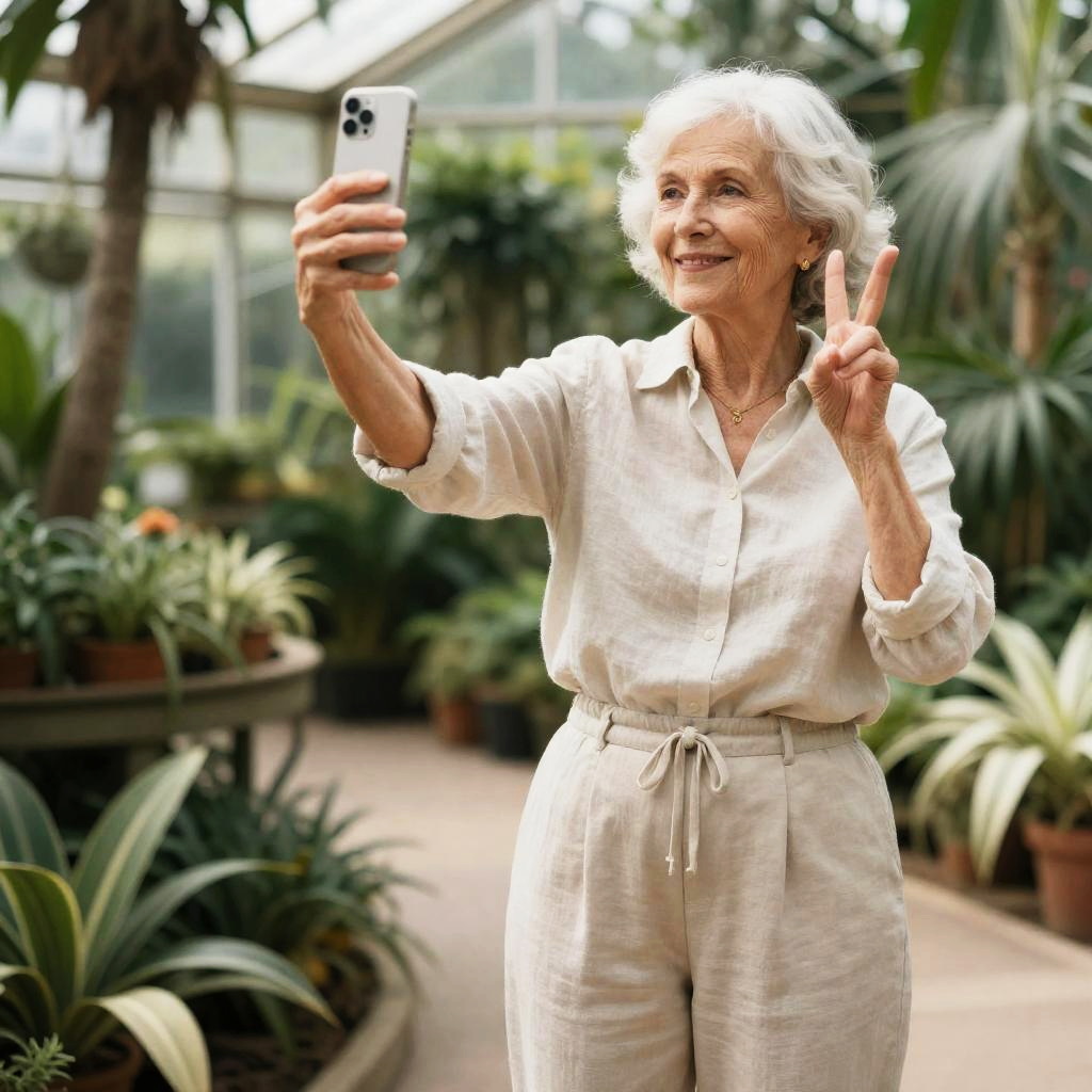 Middle-aged Woman Taking Selfie in Coffee Shop