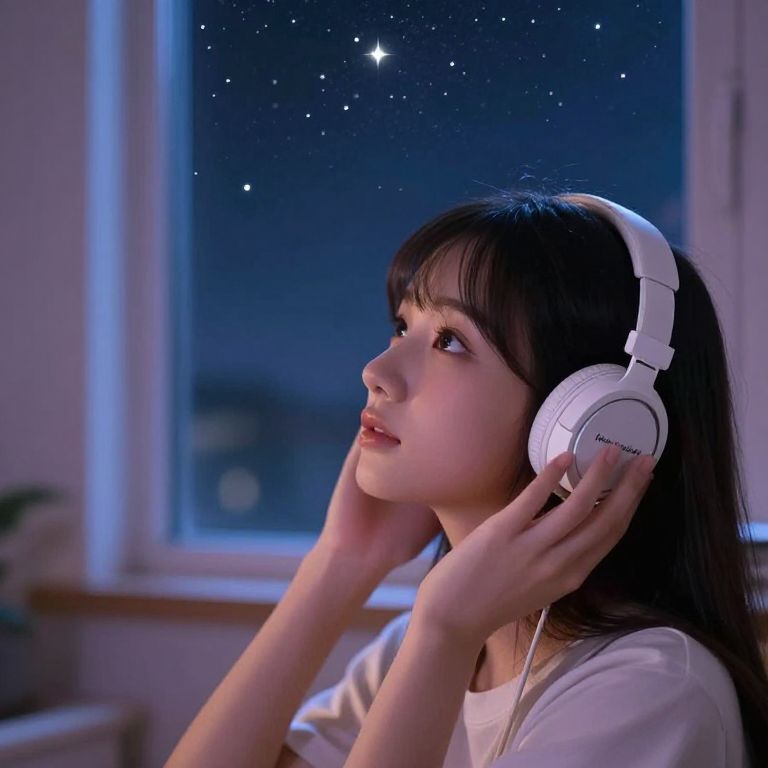 Photograph of an Asian woman with long, straight black hair and bangs, wearing white headphones labeled "Audio-Technica". She is gazing up at a night sky visible through a window, filled with twinkling stars. She has fair skin and is dressed in a plain white T-shirt. The room is softly lit with blue and purple hues, creating a serene, dreamy atmosphere. Her hands are gently holding the headphones over her ears, and she has a contemplative expression on her face. The background is slightly blurred, focusing attention on her and the starry night.