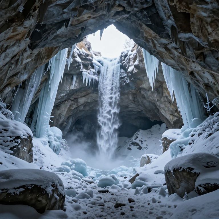Photograph of a majestic, icy cave with a cascading waterfall at its center. The cave's dark, rocky walls are adorned with long, sharp icicles hanging downward. Snow blankets the cave floor and rocks, creating a bright, white landscape contrasting with the dark cave interior. The waterfall, illuminated by light from above, plunges from the cave's opening, creating a misty effect as it hits the snowy ground below. The image captures the cold, pristine beauty of the frozen environment.