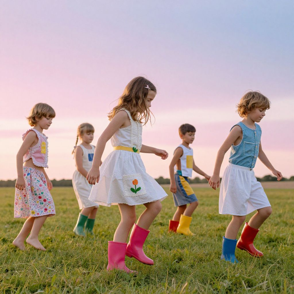 Children photo prompts: A group of kids exploring a rural farm at dawn, hands in dust, looking at chickens and a small barn, soft morning light, rustic textures, peaceful atmosphere, photojournalistic style, high detail and realism.