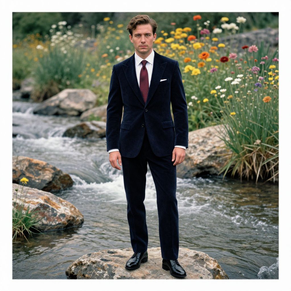 A man, elegant navy velvet suit, tailored fit, peak lapel jacket, crisp white dress shirt, silk burgundy tie, polished black leather shoes, rocky riverbank, cascading water, vibrant wildflowers in bloom, lomography analog photo, confident expression. Man has masculine face and piercing eyes