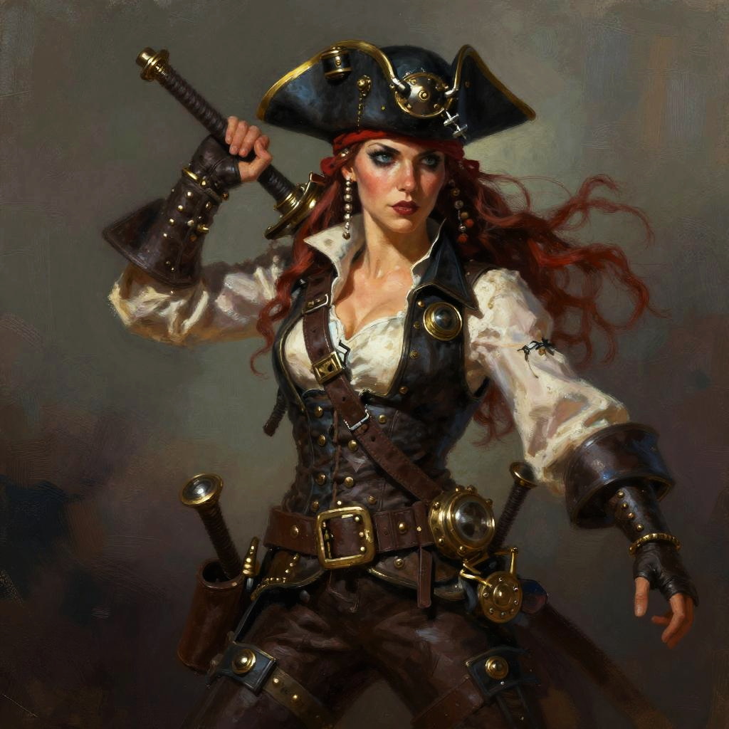 Digital painting of a fierce, red-haired pirate woman in a black tricorn hat, leather jacket, and corset, with swords and belts, against