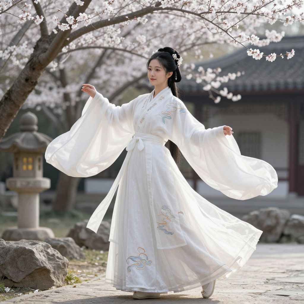 Hanfu female walking gracefully by a tranquil lake at sunset, elegant layered robes in pastel shades, long sleeves gently swaying in the breeze, traditional Chinese architecture faintly visible, poetic and peaceful atmosphere, fine lace details and accessories