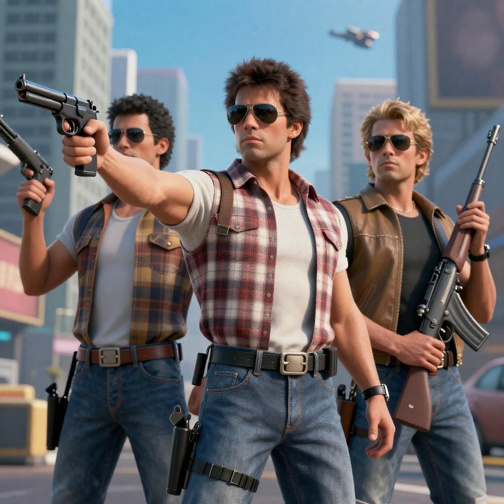 Photorealistic CGI scene with three muscular men in 80s-style clothing, sunglasses, and guns. One points a gun, another holds a rifle, both wear plaid shirts. Background: blue-tinted cityscape with tall buildings, billboards, and a flying object.