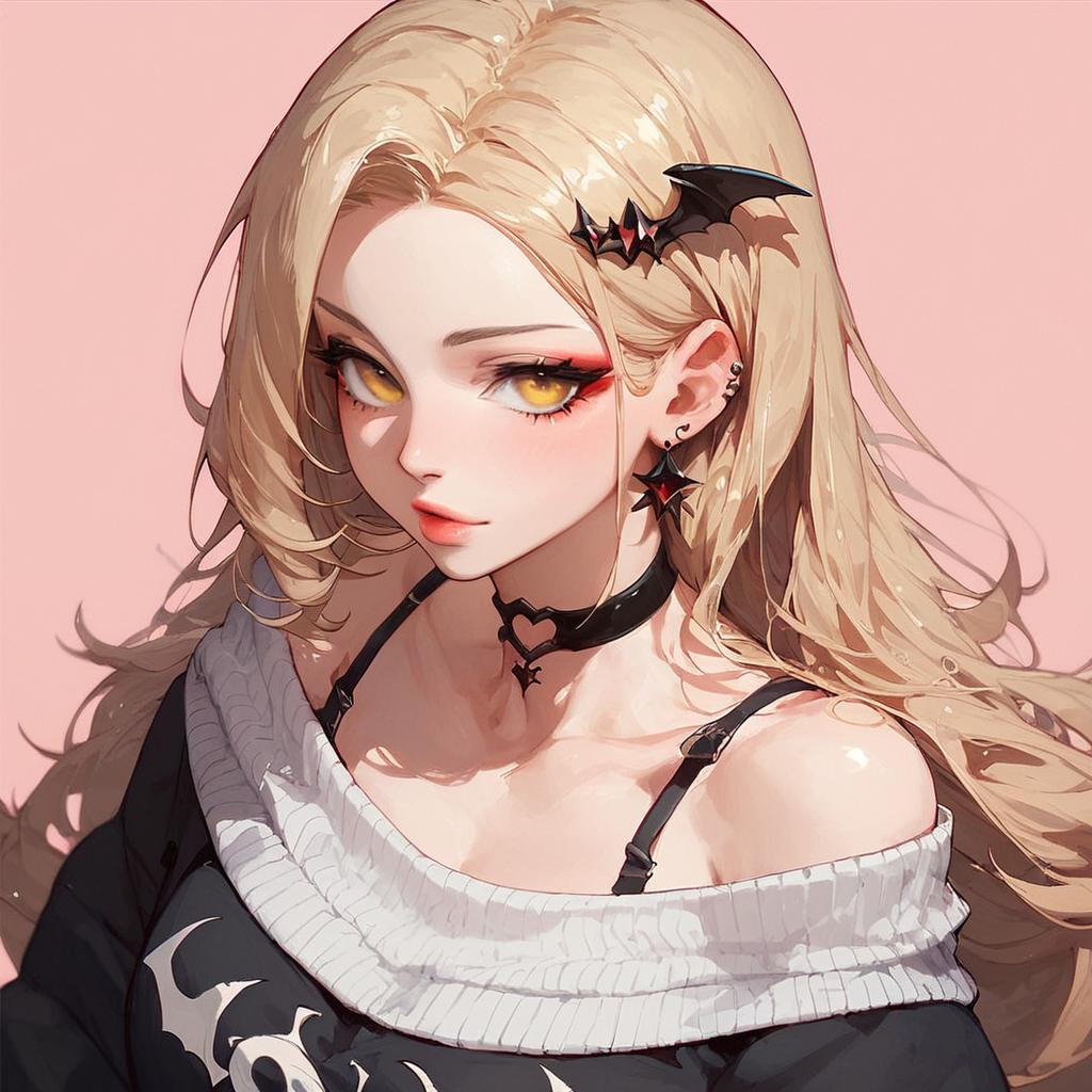 Digital anime-style portrait of a blonde woman with yellow eyes, black bat earrings, black choker, white-off shoulder sweater, and black top. Pink