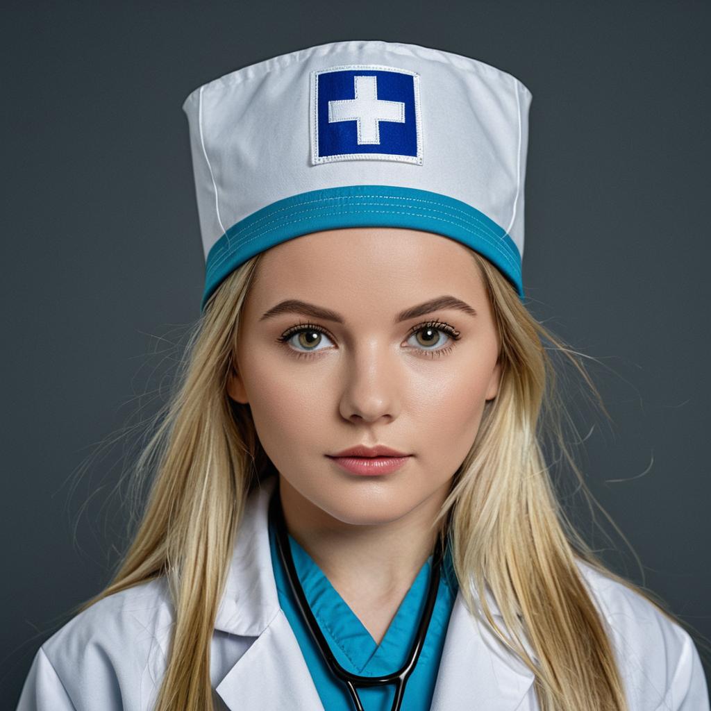 Child doctor costume ,1girl, solo, blonde hair, realistic, hat, blue eyes, looking at viewer, lips, portrait, long hair, grey background, closed mouth, photorealistic, nose, simple background