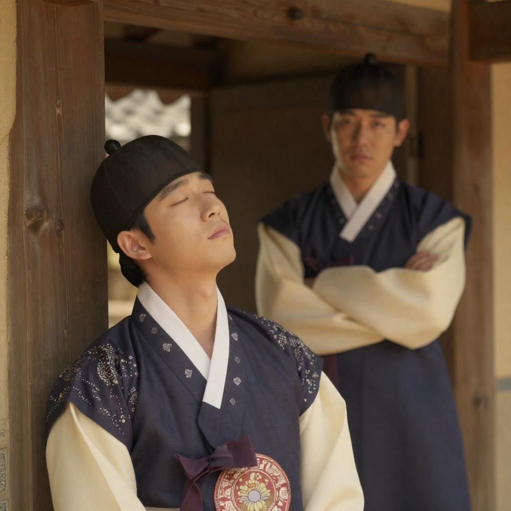 Two people in traditional Chinese clothing. Woman with short black hair, green dress, stands behind man with closed eyes, red headband, red and gold patterned robe. Red lamps on wooden table, framed paintings on wall. Man sits on bed, hands on lap. Warm, dim lighting.