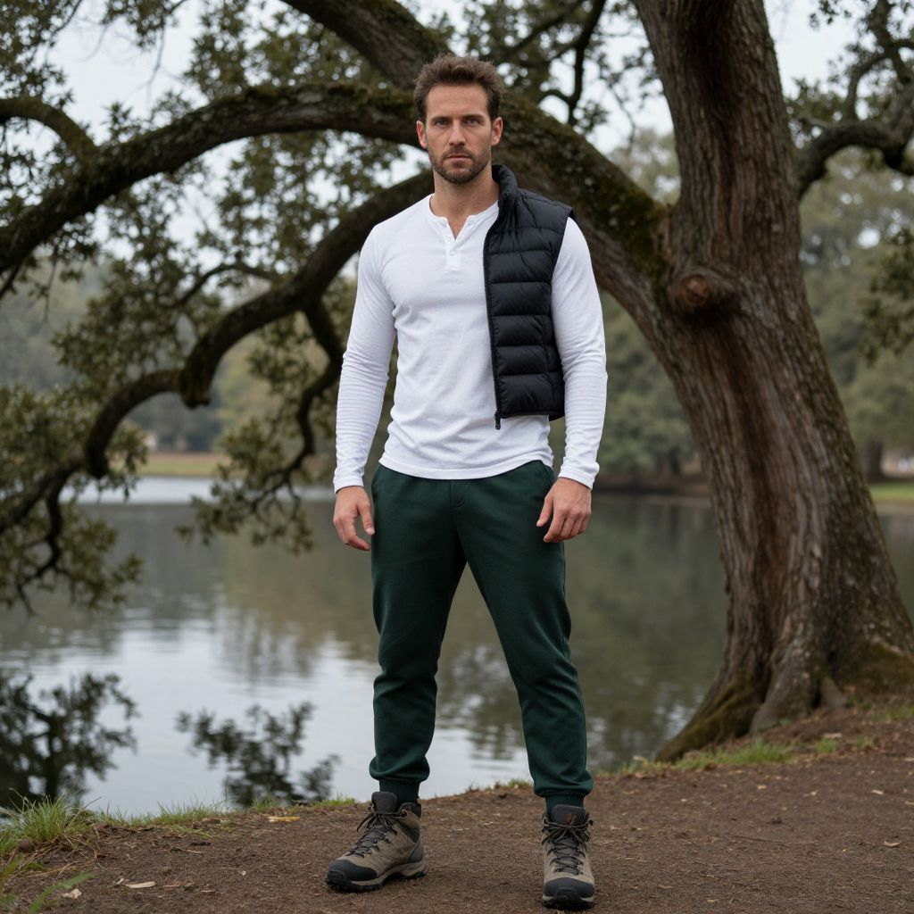 A man, dark green joggers, fitted white long-sleeve henley, cropped black puffer jacket, rugged hiking boots, standing among ancient oak trees, serene lake reflections, pinhole camera style, contemplative expression.Man has masculine face and piercing eyes