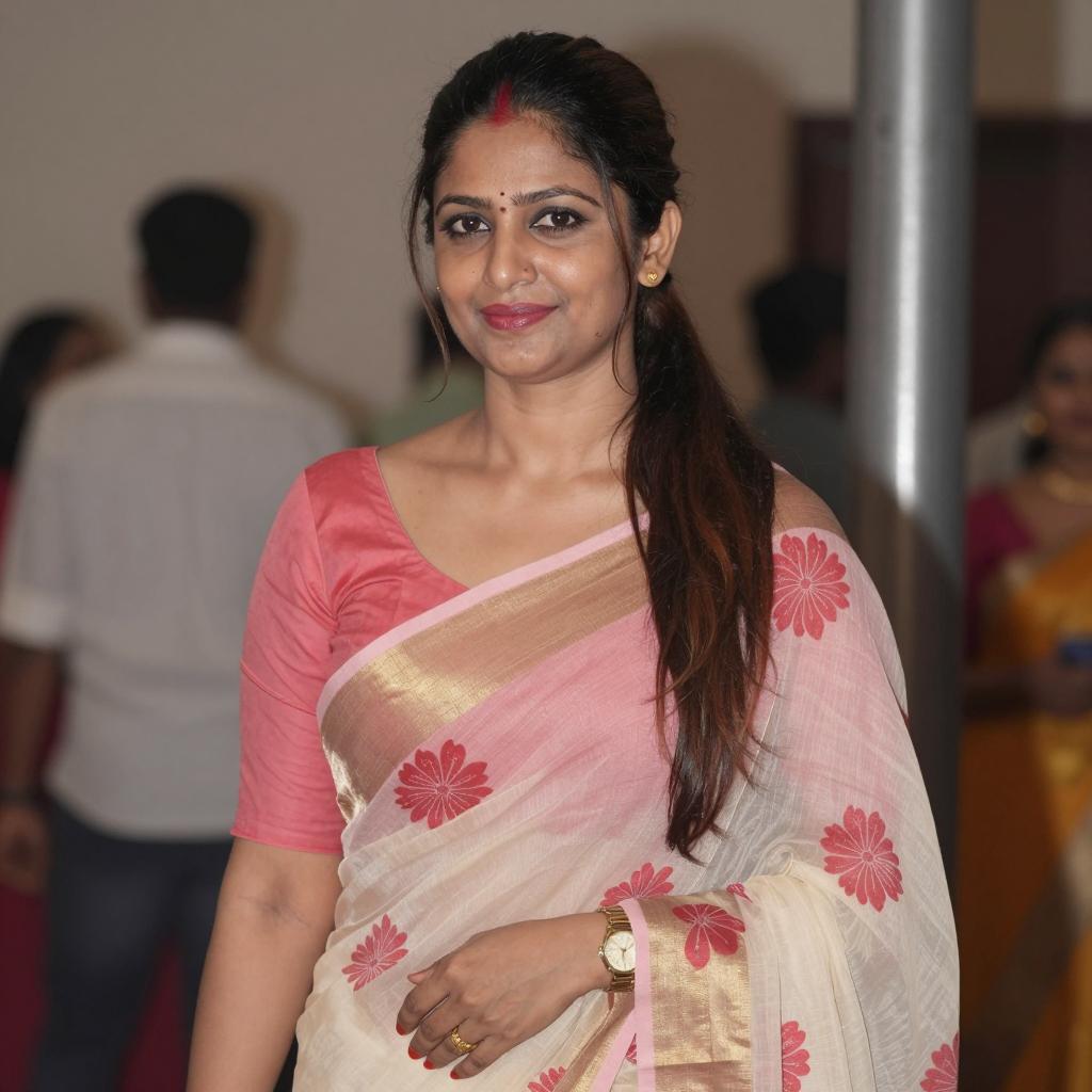 A man and woman standing together in front of a crowd. The man, with light brown hair and a serious expression, wears a white shirt and black tie. The woman, with short black hair and large sunglasses, wears a pink patterned sari and holds a black clutch. A police officer in a grey uniform and white hat stands to the right. Several journalists with microphones are in the background. The setting is indoors with a ceiling and walls visible. Four people in total.