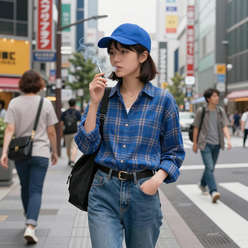 A young Asian woman wearing a blue plaid shirt, blue jeans, and a blue cap is smoking on a busy city street during the daytime. She has one hand in her pocket and carries a black backpack over one shoulder. The urban setting includes other pedestrians, crosswalks, colorful buildings, and street signs with Japanese text visible in the background.