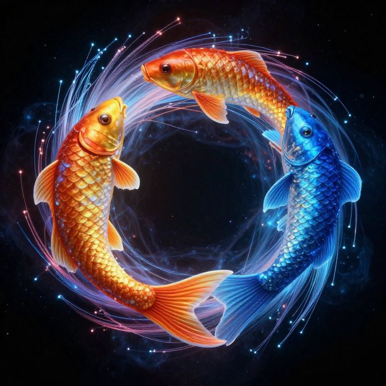 The image presents a mesmerizing scene of two Pisces zodiac symbols intertwined in a circular pattern, creating a sense of harmony and balance. The symbols are depicted with an ultra-realistic and highly detailed appearance, showcasing intricate textures and vibrant colors. One Pisces is rendered in warm, incandescent hues of orange and yellow, while the other is in cool, blue tones, symbolizing the duality of the zodiac sign. The two symbols are connected by a series of glowing, optical fiber-like strands that form a radiant nebula, adding a psychedelic and otherworldly quality to the composition. The background is a deep, starry black, which enhances the luminosity of the Pisces and the nebula, making them stand out prominently. The overall arrangement of the symbols and the nebula creates a dynamic and visually captivating image, with the Pisces appearing to be in motion, as if they are dancing or swirling around each other. The composition is balanced, with the Pisces and the nebula evenly distributed, creating a sense of symmetry and equilibrium. The image is a stunning representation of the Pisces zodiac, combining elements of astrology, astronomy, and art to create a visually striking and emotionally evocative piece.
