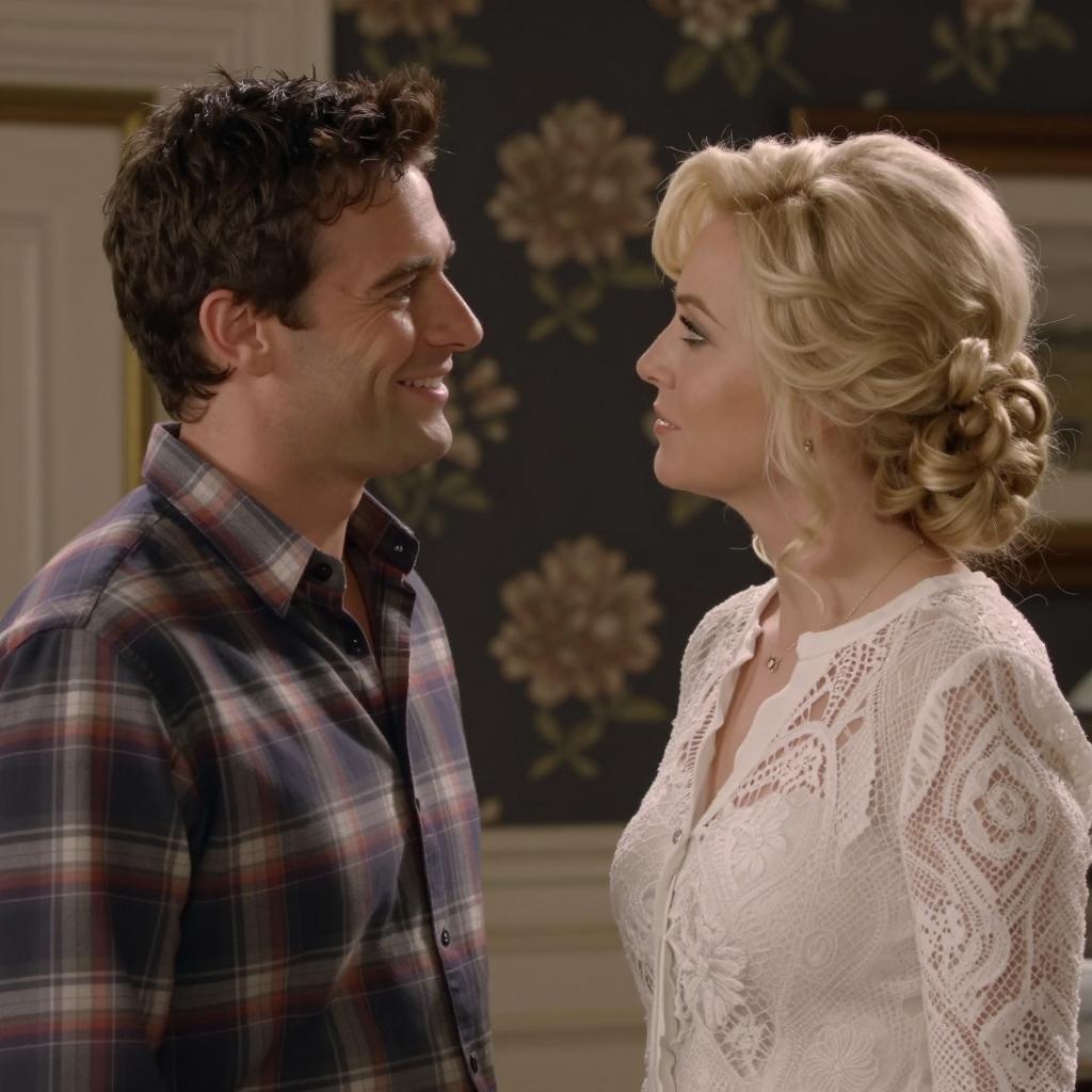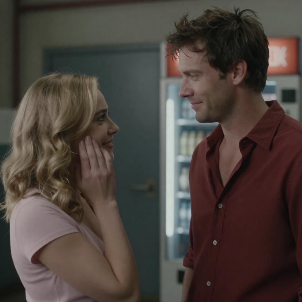 Photograph of two people in a room, facing each other. Woman on left with blonde hair, red shirt, smiling. Man on right with brown hair, white shirt, leaning forward, smiling. Background has red wall, shelves with action figures. Man's right arm on table, woman's left hand resting on table. Warm lighting.