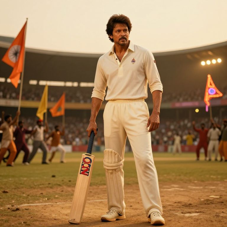 Photo with Rajinikanth holding a vintage cricket bat in a retro 1970s stadium scene, fans waving traditional flags, neon lights glowing, golden hour atmosphere, dramatic depth of field, realistic skin texture, full body shot, authentic Indian cultural setting.