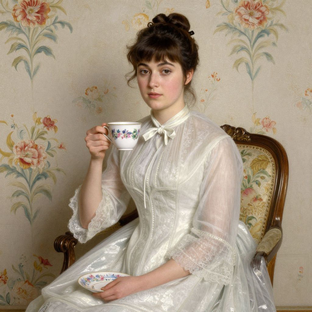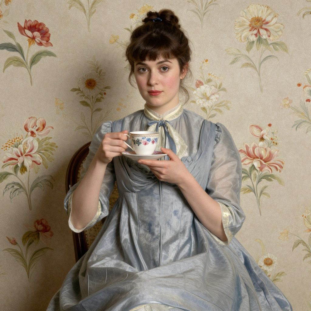 A woman in a Victorian-era gown sits gracefully against a floral wallpaper backdrop, holding a delicate teacup, evoking the refined elegance of Mary Cassatt's impressionistic style in her 1897 oil painting \"The Cup of Tea.\
