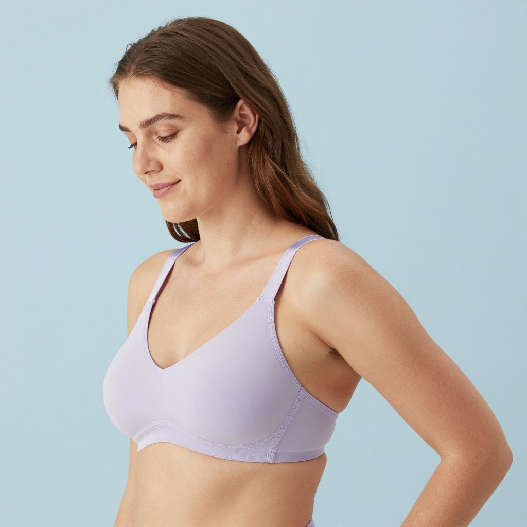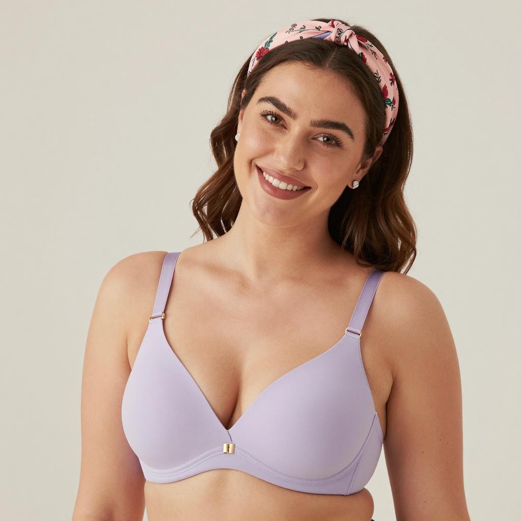 Photograph of a woman with light brown, shoulder-length hair, wearing a purple bra. She is smiling, looking down, and adjusting the bra straps with both hands. Her skin is fair. Background is plain white. She has a slight, natural makeup look. Her body is slightly turned to the right. Her right hand holds the left strap, while her left hand grips the right strap.