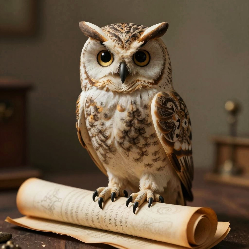 Photograph of a detailed, realistic owl with brown and white feathers, large yellow eyes, perched on a rolled-up paper in a dimly lit