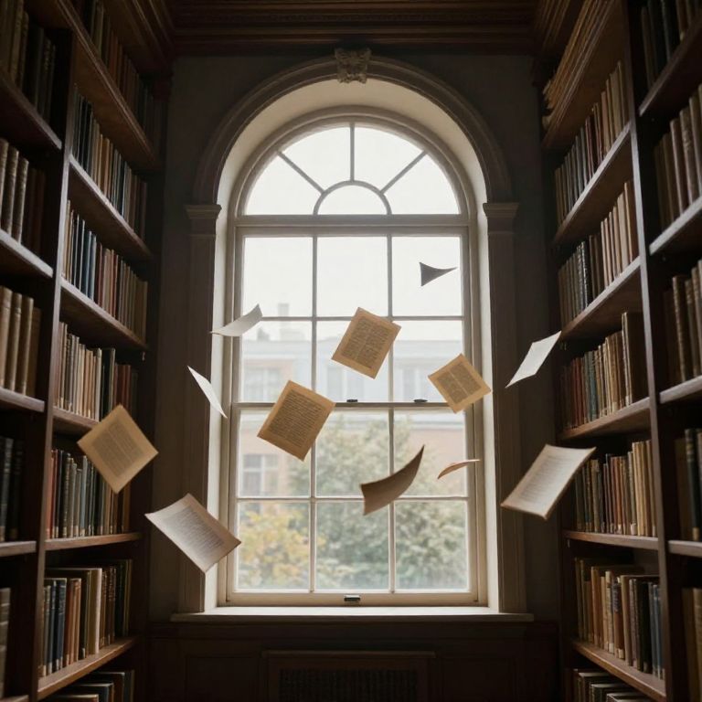 Sunlight streams through a grand arched window, illuminating a timeless library filled with towering wooden shelves lined with ancient books, while scattered papers and a mysterious podium rest on the stone floor below.