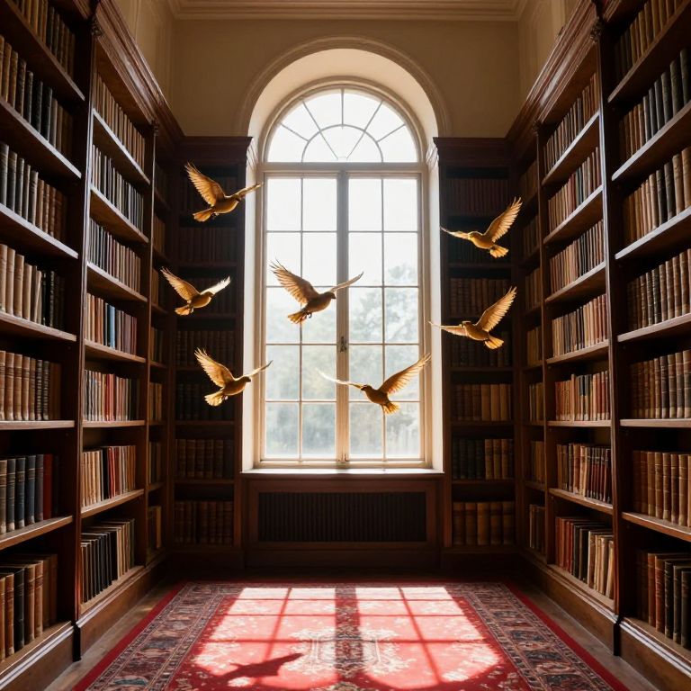 Photograph of a dimly lit, elegant library with tall, wooden bookshelves flanking a large arched window, sunlight streaming in, and