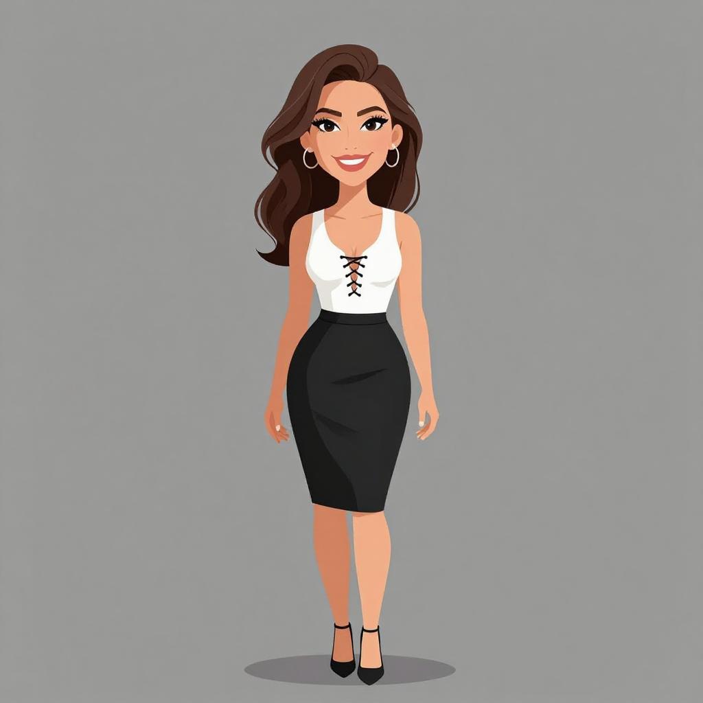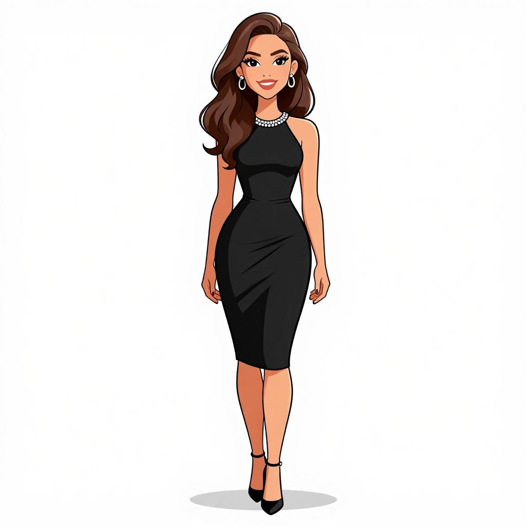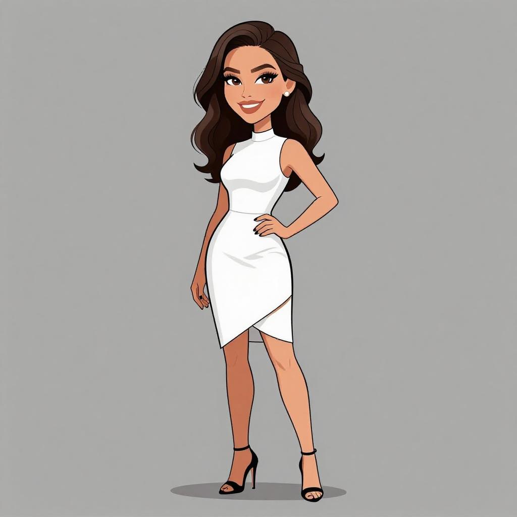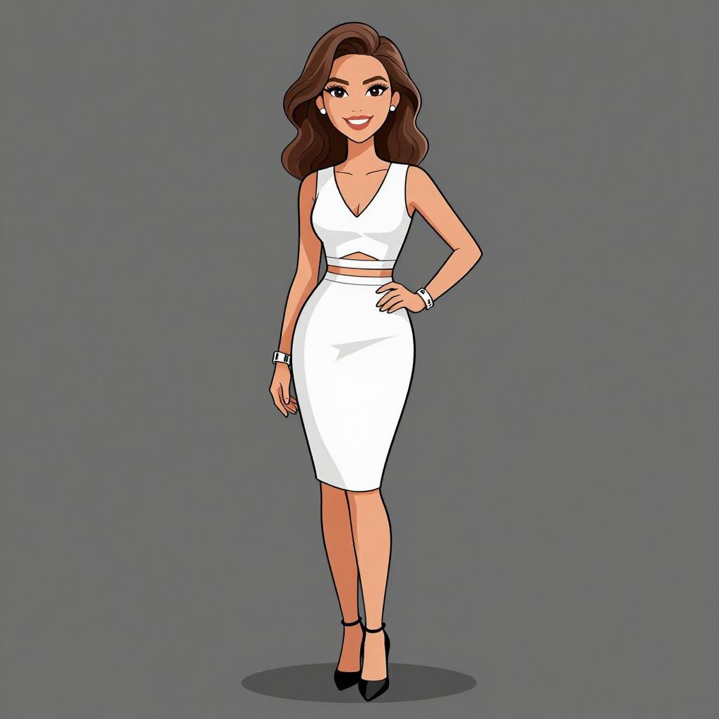 Woman with pretty face and pretty hair. smiling Woman, chic, white sleeveless dress with V-neck and midriff cut-outs, knee-length, horizontal sheer panel stripes, tapered waist, bodycon silhouette, black strappy high heels, metallic cuff bracelets. --sref 1467