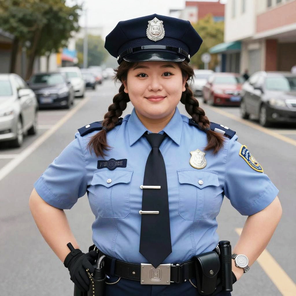 Plus Size Playful Police, woman in uniform standing on the street with a police hat