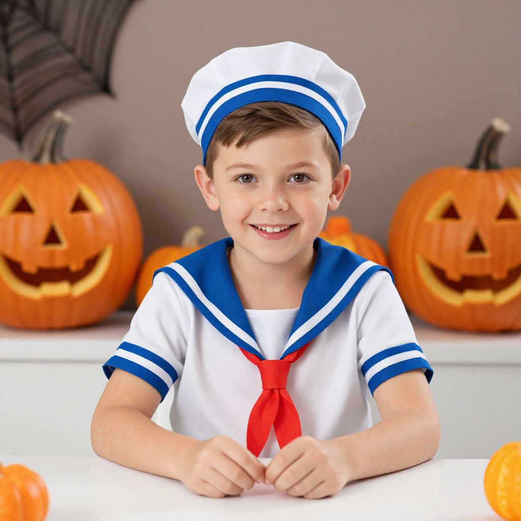 Sailor Halloween Costume Boy, boy in sailor costume sitting at table with pumpkins in background
