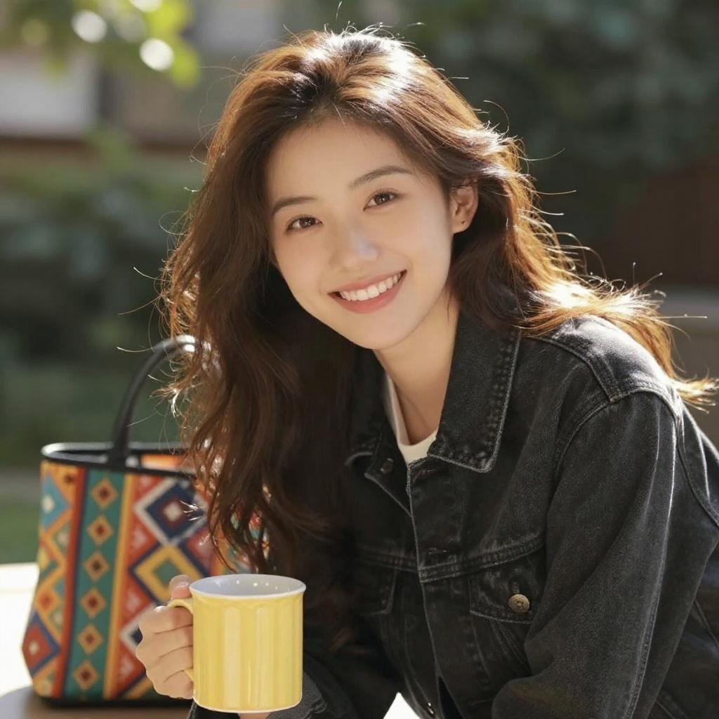 Photograph of a smiling young woman with long, wavy brown hair, wearing a black denim jacket, leaning forward. She holds a yellow mug in her right hand. Behind her, a colorful patterned bag and blurred greenery are visible. Bright sunlight highlights her face and hair.